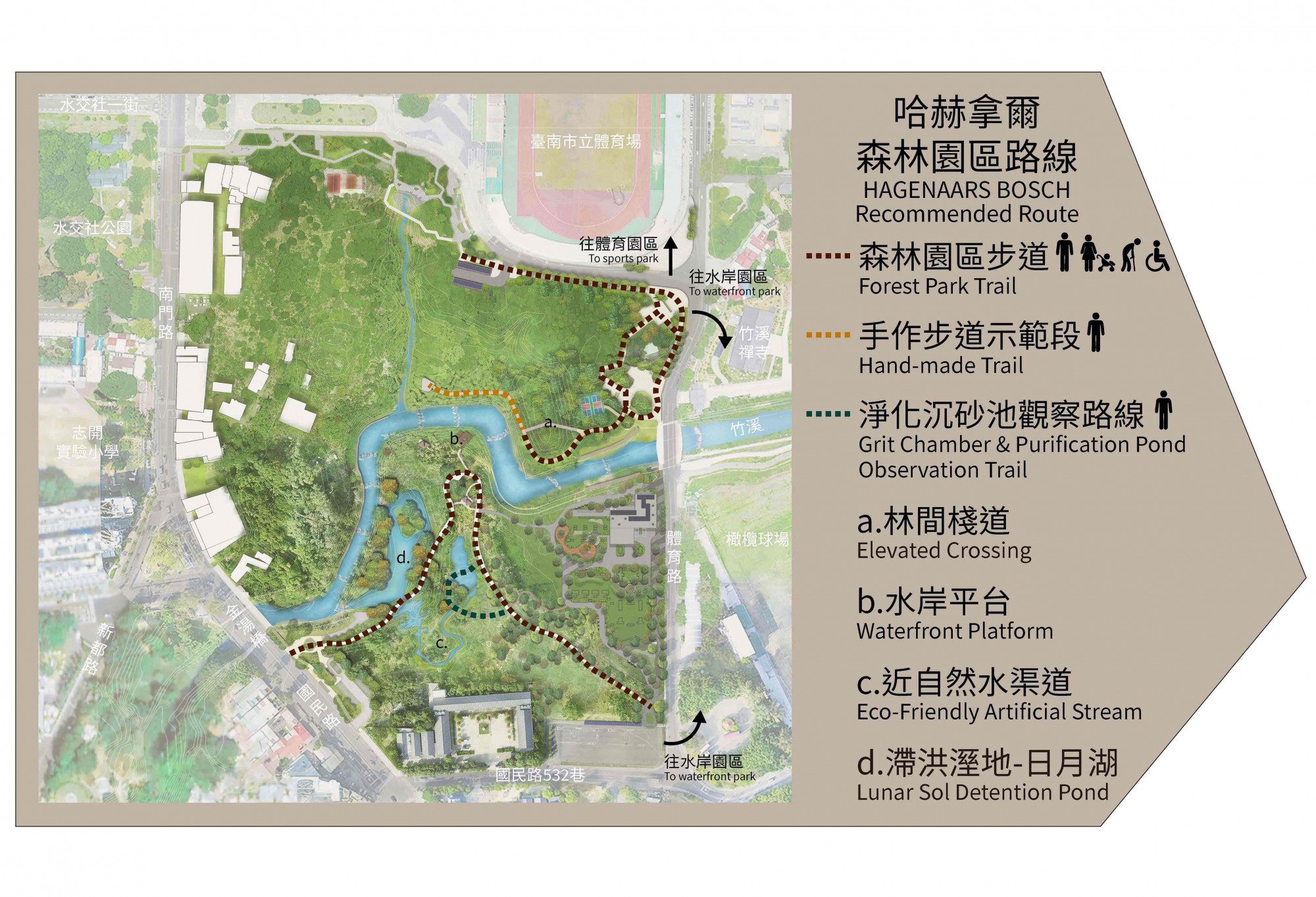 水利局說明,生態資源豐富的竹溪森林段河道背後,肩負著重要的市區排水功能,為將這片美麗珍貴的原始森林保留給市民,亦確保竹溪在極端氣候的挑戰下,兼顧防洪安全的重要任務,市府團隊採用「森湖溪」概念推動營造工程,也榮獲行政院公共工程委員會「第24屆公共工程金質獎」肯定。「森」為哈赫拿爾森林,採用自然解方推動水利工程,保留既存原始森林生態;「湖」為日月湖,為臺南市首座將水岸棲地維護理念融入操作機制,兼具防洪機能的人工湖,湖中有日月兩座小島,月島配合生態調節水位時,會有不同的形態,如同月有陰晴圓缺,反之日島則不因水位調整而消失;「溪」則為竹溪,民眾可由法華橋開始,經過月見橋,漫步至竹溪橋,右岸可至廣場入口拍攝竹溪意象鋼雕鹿打卡,亦可走森林園區步道,深入手作步道探訪哈赫拿爾森林,左岸可走淨化沉砂池觀察路線,近自然水渠道串聯綠帶,體驗水岸縫合,藍綠網絡的滯洪溼地日月湖。