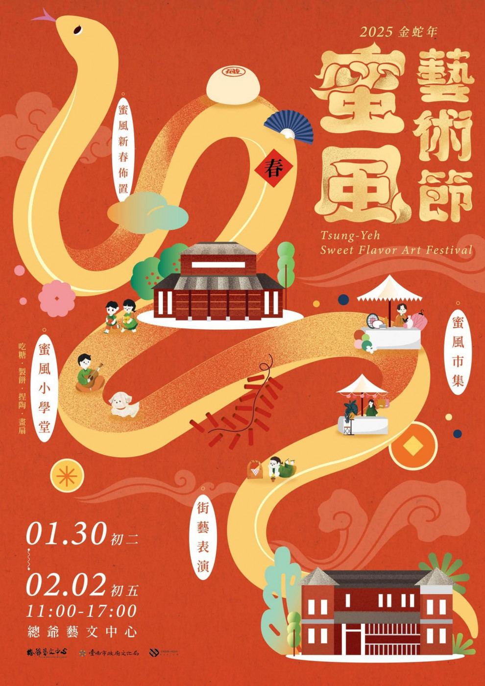 2025總爺蜜風藝術節即將開始,今年將從初二至初五(1月30日至2月2日)陪伴大家吃甜甜、過好年,總爺藝文中心規劃了蜜風市集、街頭藝人表演、氛圍佈置及甜蜜小學堂DIY體驗,結合糖業歷史介紹,讓民眾走進總爺感受到甜蜜蜜的喜氣,來拍照、打卡、吃美食,適合全家大小一同出遊,蛇來運轉迎新春。