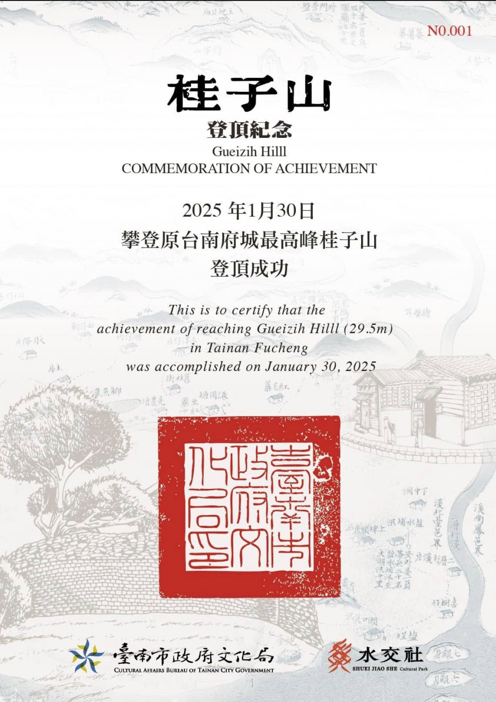 文化局說明,水交社文化園區曾經是日治時期駐防臺南機場的臺南海軍航空隊,其官兵、眷屬之居所。國民政府遷臺後,水交社由空軍接收,成為443聯隊之基地,成為空軍官兵及眷屬居住眷村。旁邊的桂子山為原府城最高峰,已於1月8日正式啟用,新春期間特別舉辦桂子山登頂集運活動,登上桂子山,為蛇年集滿好運,初二至初五12點開始,每日登頂府城最高峰拍照分享社群的民眾,前100名可獲得登頂集運證,其中前30名加贈思味市集指定攤位餐點一份,歡迎民眾來俯瞰整個台南的美麗風光,迎接春天的來臨。