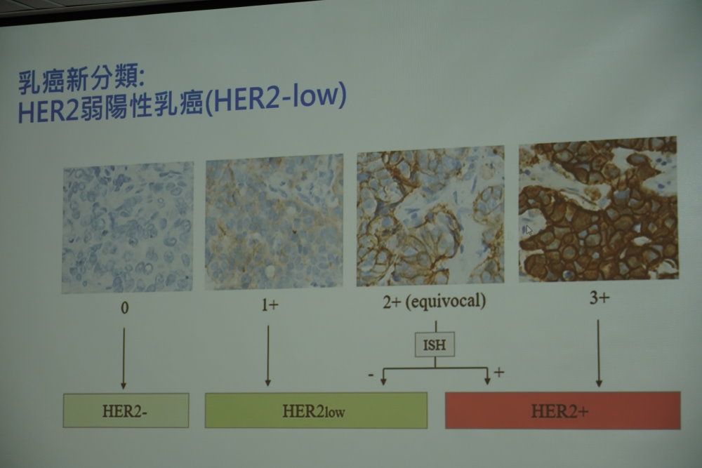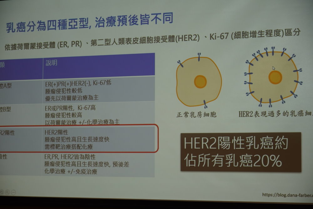 成大醫院腫瘤醫學部楊舜如醫師說明,HER2陽性乳癌定義為免疫組織化學染色(IHC)3+,或是免疫組織化學染色2+合併螢光檢驗法(FISH)為陽性的患者。HER2陽性乳癌因癌細胞生長迅速、容易復發及轉移,及較易產生抗藥性,被視為較具侵略性的亞型,大約佔所有乳癌患者20%。然而,隨著HER2標靶治療的進步,特別是近年來被譽為神奇子彈的「抗體藥物複合體(Antibody-drug conjugate, ADC)」藥物發展,為患者帶來更有效、更精準的治療選擇。