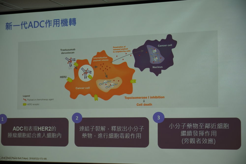 「抗體藥物複合體(Antibody-drug conjugate, 簡稱ADC)」核心技術結合「標靶治療」與「化學治療」的優勢,透過「單株抗體—連結子—小分子藥物」的結構,藉由標靶特性精準抵達腫瘤,並利用小分子藥物的細胞毒性,有效毒殺標的物(癌細胞),不僅效果好,也大幅減低全身性副作用。同時,新一代ADC還具備「旁觀者效應(bystander effect)」,可一併攻擊未表現HER2的周遭癌細胞,就如同子彈直接正中目標、對症下藥。