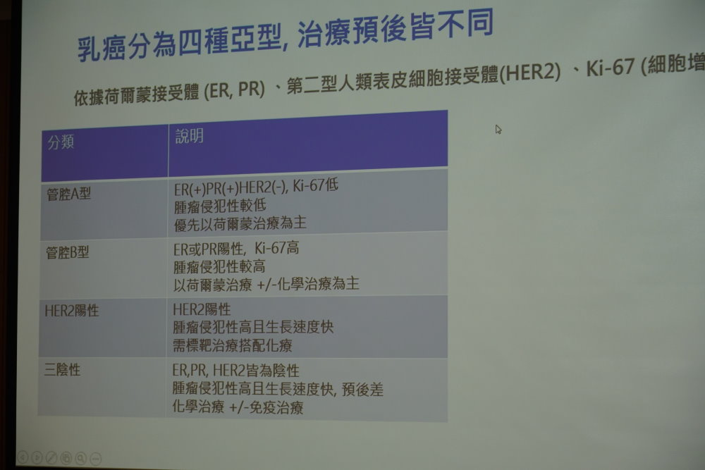 【記者田進山/台南報導】乳癌為台灣女性發生率第一位的癌症,媒體報導曾見許多名人罹患乳癌,甚至年紀輕輕即因而早逝。依據乳癌細胞所表現的雌激素受體(ER)、黃體激素受體(PR)、第二型人類表皮生長因子受體(HER2)和細胞生長分裂指數(Ki-67),可將乳癌分為數種亞型,治療方式與預後會有所不同。