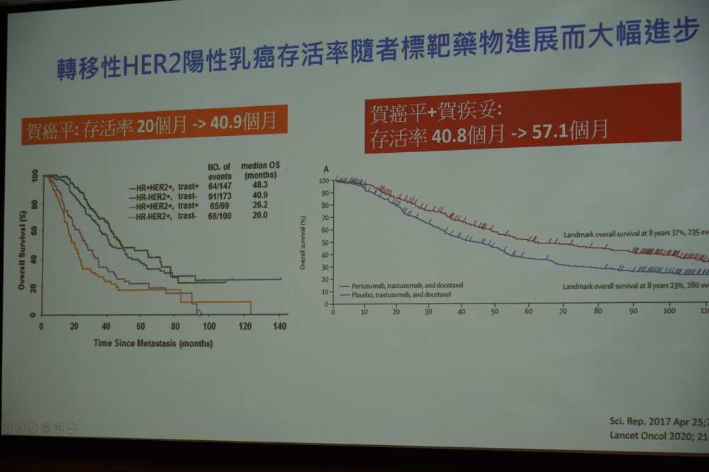 楊舜如醫師分享,50歲的張女士因HER2陽性乳癌轉移至腦部,出現嚴重頭暈等不適症狀,她擔憂治療效果有限,也開始為臨終做準備。在成大醫院全方位的治療策略下,張女士接受手術合併ADC藥物治療,持續用藥超過3年皆無復發跡象。目前,轉移性HER2陽性乳癌患者有2種可使用的ADC藥物。其中新一代的ADC,根據大型臨床試驗數據,即使是已接受多線治療仍惡化的患者,使用後可達16.4個月的無惡化存活期;若於第二線治療使用,無惡化存活期的中位數為29個月,相較於其他標準治療的7.2個月,顯示總生存期有顯著延長。