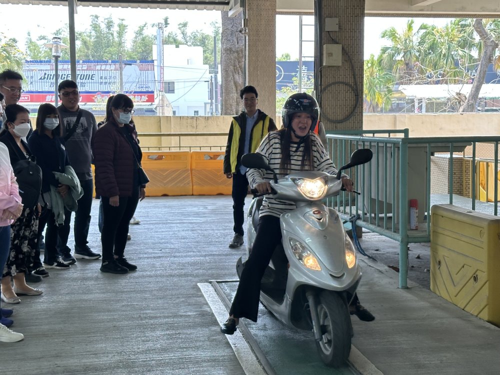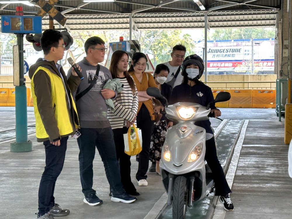 現場宛如小型聯合國駕訓班,新住民學員輪番上陣,笑聲與驚呼聲此起彼落,來自越南的阿蘭踏上機車發動油門,只見她騎乘在直線7秒車道上,雖然車身有些搖晃,但始終緊握龍頭、全神貫注,努力保持平衡。完成挑戰後,阿蘭帶著靦腆的笑容分享道:「剛開始真的有點緊張,但有工作人員在旁陪伴及鼓勵,讓人覺得很安心,透過這次模擬考試,讓我更熟悉流程,也增強信心。」隨後移動至汽車試場,觀摩倒車入庫、曲線進退等關卡,由專人演示常見的違失情形,例如車輪壓線或中途熄火等,透過解說,讓參與的新住民不僅「看得懂」,更能「記得住」,紛紛表示收獲滿滿,對相關規定有更清楚的認識。