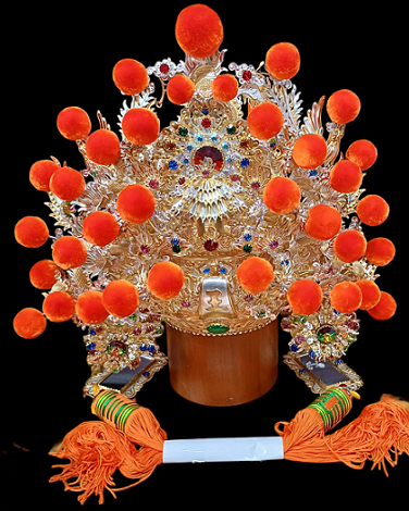 郭春福表示,神帽是配角、神像才是主角,主次關係得分明,一頂好的神帽要有畫龍點睛之效,比例大小適宜外,更講求體面,必須接合精密且配件與紋飾也都要留意。他的神帽形體流暢,弧度優美,兼顧力學與平衡;正面造形繁複,龍鳳花鳥靈動鮮活、錯落有致,並匠心獨運的以「黻」紋為飾,就連帽桶也毫不馬虎,圖案滿布卻不凌亂,既傳統又不失雅氣。