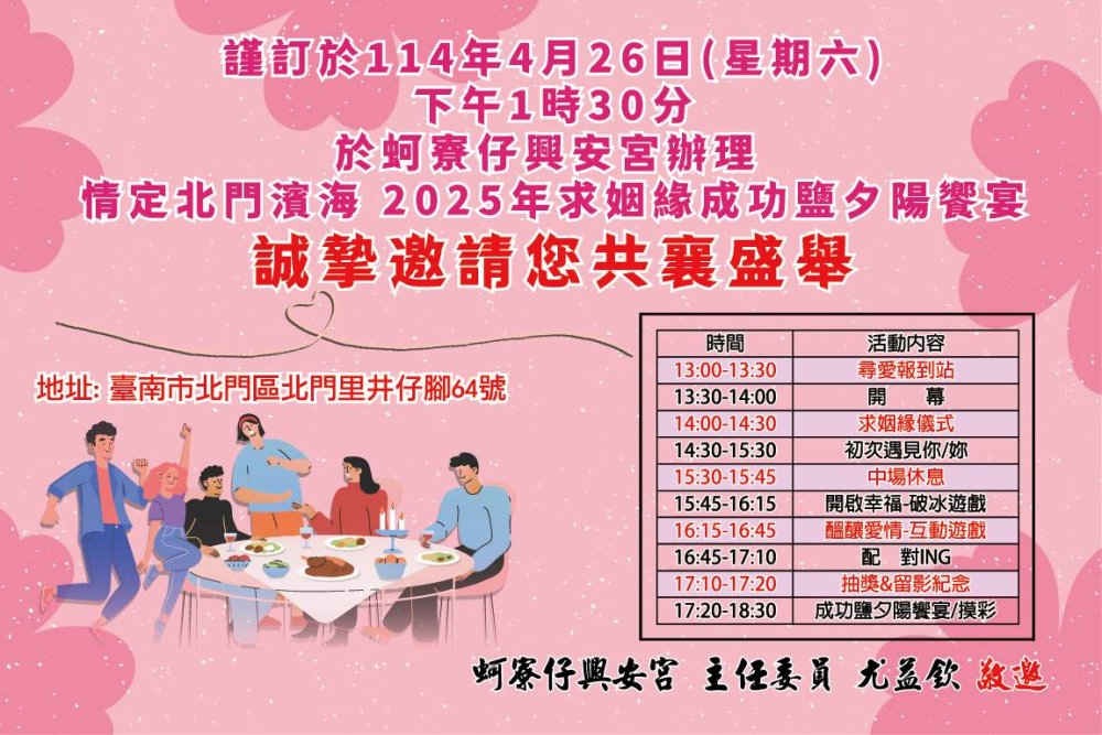 【記者黃石泉/台南報導】蚵寮仔興安宮訂於114年4月26日舉辦一場「情定北門濱海2025年求姻緣成功鹽夕陽饗宴」聯誼活動,透過豬母娘娘為百位單身男女牽姻緣覓真愛。