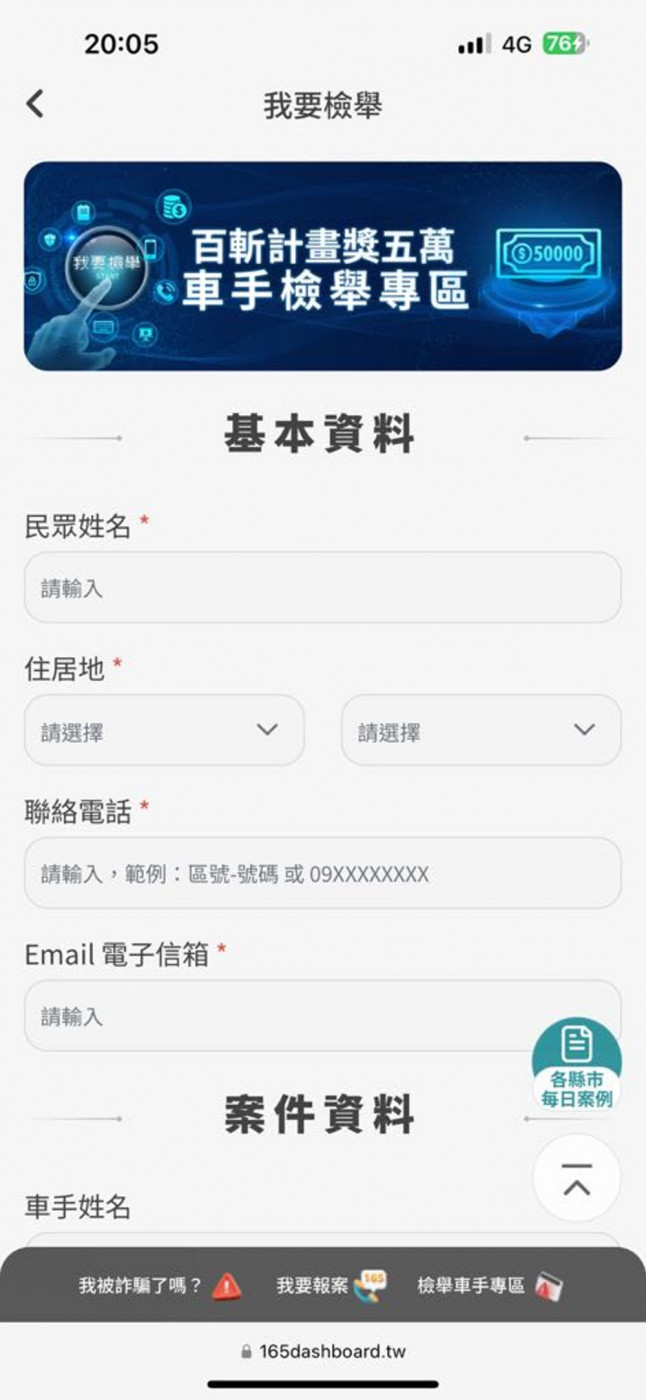 【記者田進山/台南報導】檢檢舉車手竟有5萬元賺!警政署於4月1日宣布「百斬計畫獎5萬號召全民檢舉車手」,鼓勵民眾從「被動防衛」轉成「主動出擊」,透過165打詐儀錶板「百斬行動檢舉車手專區」,填報檢舉車手線索情資,情況緊急時亦可撥打110或165即時檢舉,提供有關詐欺車手的關鍵訊息,經警方成功拘提或逮捕車手到案,即可獲頒新臺幣5萬元檢舉獎金。
