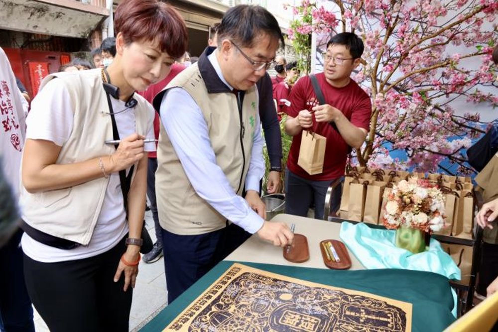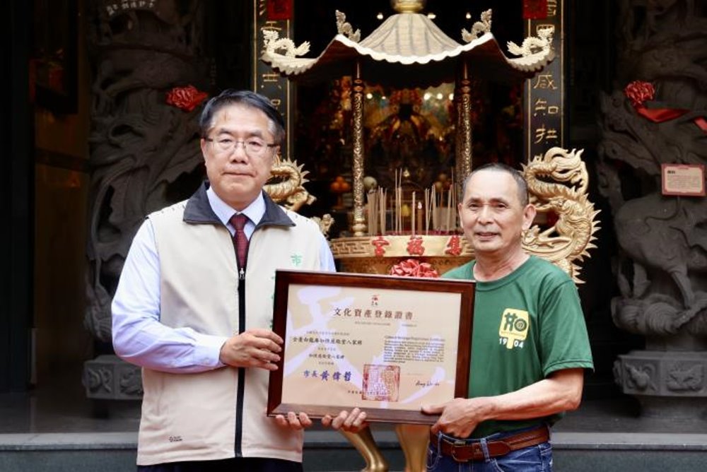 圖:市長黃偉哲親自頒發「文化資產登錄證書」及「頭旗」(記者黃石泉攝)