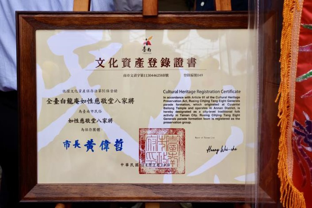 【記者黃石泉/台南報導】「全臺白龍庵如性慈敬堂八家將」創立於1904年,具百年以上之歷史,傳承迄今已歷5代,近年更積極推廣,參與各類展演及講座,維繫家將文化於不墜,113年2月經審議通過,登錄為臺南市「民俗類無形文化資產」,是府城地區首例。臺南市長黃偉哲今(12)日親自頒發「文化資產登錄證書」及「頭旗」,與立委陳亭妃、議員許至椿、陳怡珍等一同見證與肯定將團及家將成員長年投入傳統文化的承襲與推廣。