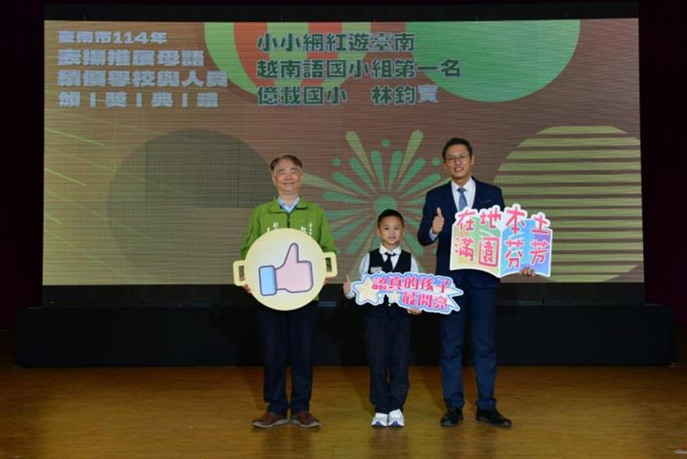 億載國小學生林鈞寶獲得越南語國小組第一名,他以越南語介紹新舊融合的保安市場,影片中他以越南語介紹市場的「新」—冷氣電扶梯與乾淨的購物空間,及「舊」—傳統攤販與庶民小吃的日常景象,生動描繪市場內的情景。他表示,感謝學校開設越南語讓他學習,希望透過影片讓越南朋友知道臺南市場的精采。