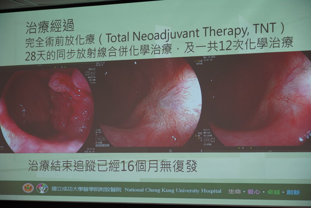 【記者田進山/台南報導】台南市一位67歲的林女士在半年前接受癌症篩檢時,發現糞便潛血呈陽性反應,起初未加留意,直到出現血便症狀才至醫院就診。經大腸鏡檢查,確診為「低位直腸癌」,腫瘤距離肛門僅3公分。傳統手術通常會完全切除肛門,並進行永久性人工肛門造口;而術前同步放化療可提供保留肛門括約肌的機會,但仍可能導致術後排便功能障礙。經全面評估及討論,林女士接受「完全術前放化療(Total Neoadjuvant Therapy, TNT)」,包括28天的同步放射線合併化學治療,及12次化學治療。後續追蹤顯示腫瘤完全消失,無需進行手術,治療後經過15個月,未見復發跡象。