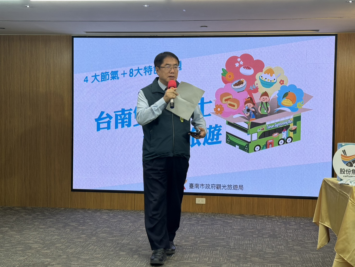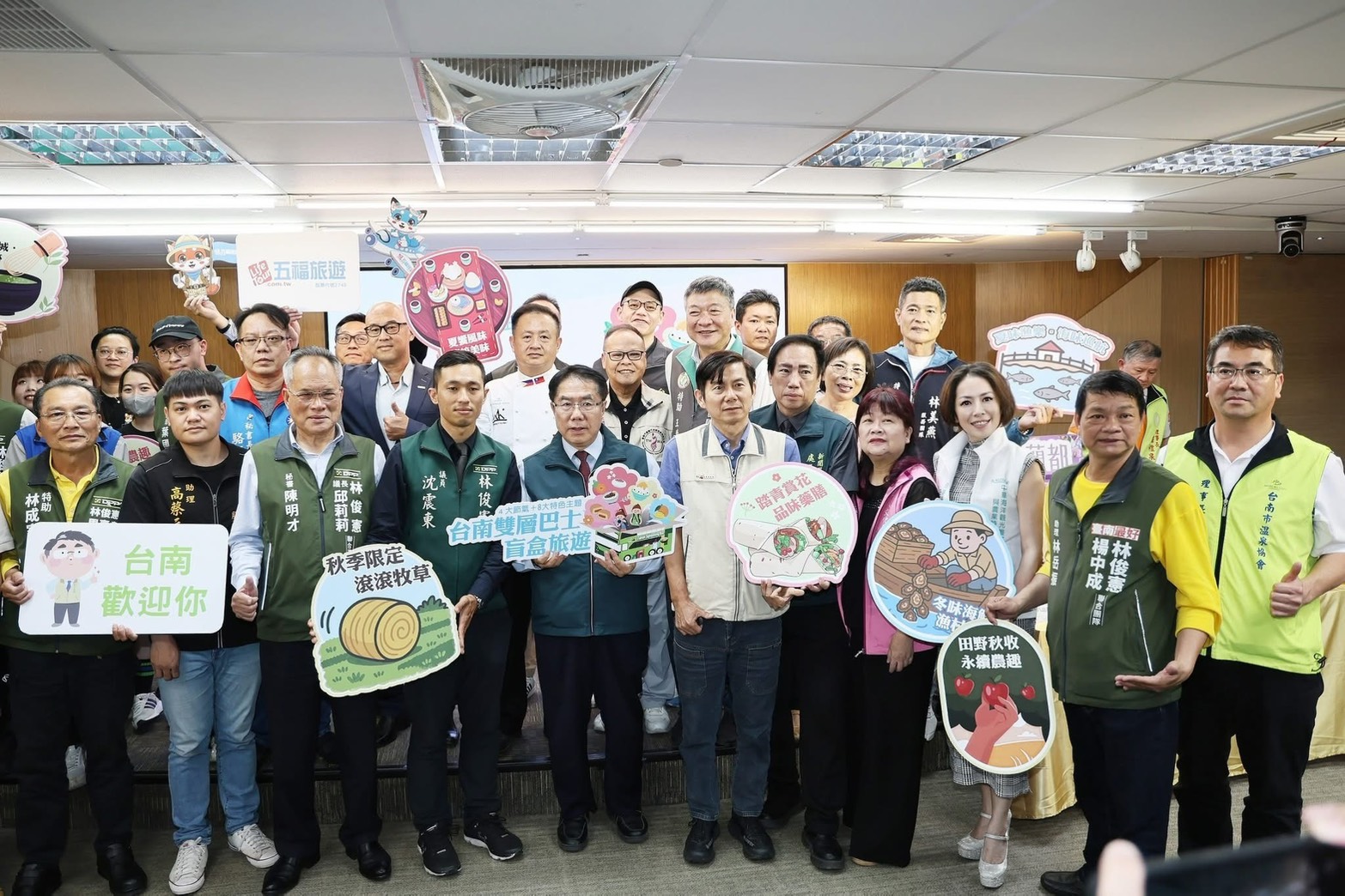 為推廣臺南多樣的觀光資源與深度文化體驗,臺南市政府觀光旅遊局推出「雙層巴士盲盒旅遊」,強調行前不揭露完整行程,讓旅客在出發當日解鎖旅程驚喜,為臺南旅遊品牌注入獨特的新鮮感與互動性。臺南市長黃偉哲今(16)日出席宣傳記者會,邀請大家開箱臺南四季風味新玩法。觀旅局局長林國華、市議員沈震東及臺南各大觀光旅遊及商業公協會代表也與會共襄盛舉。