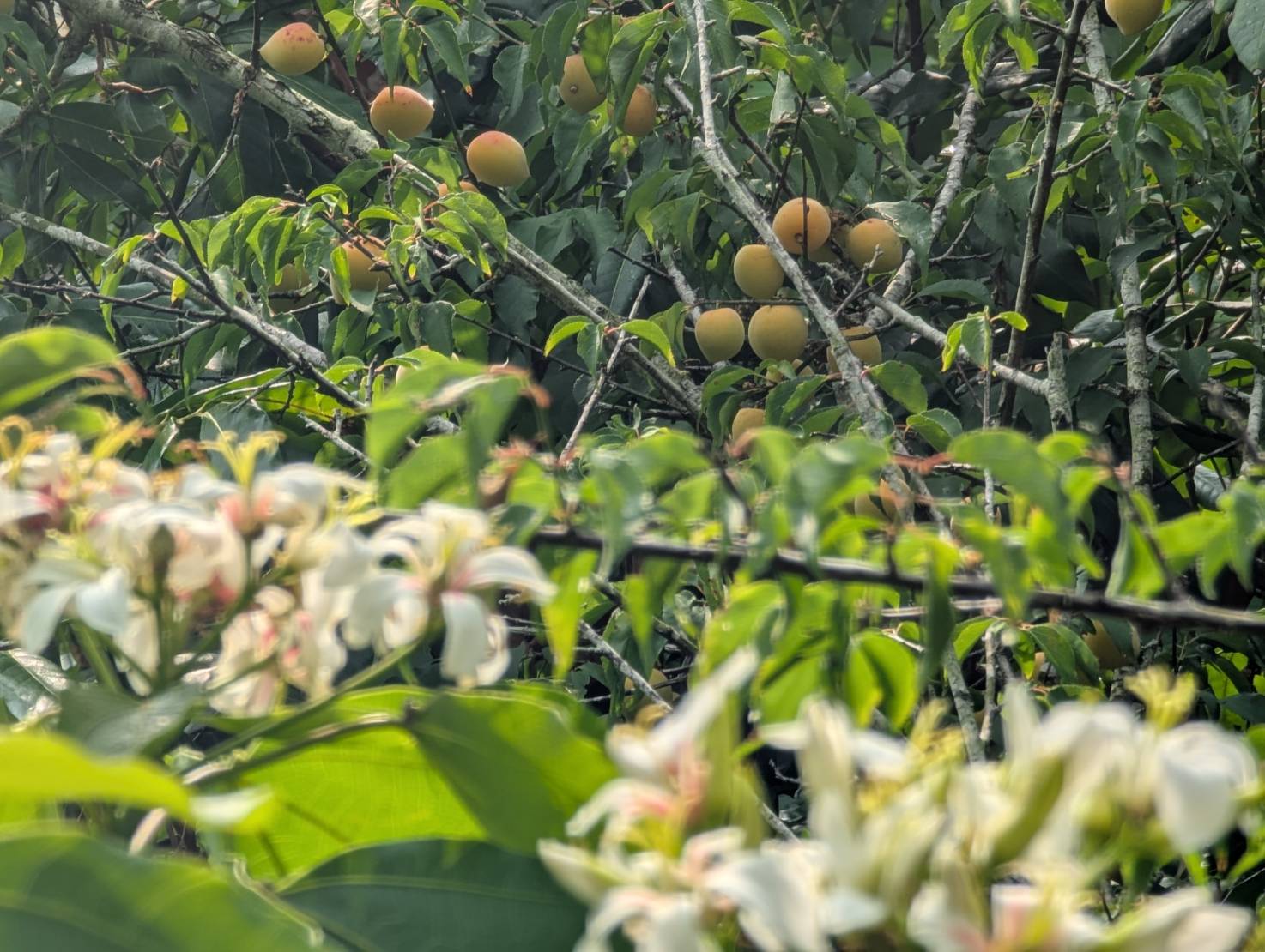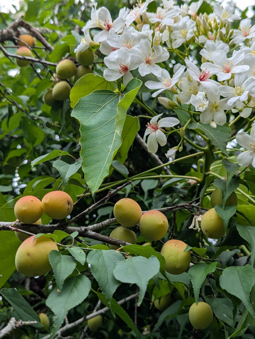 梅嶺福來梅子雞餐廳負責人陳居峰先生表示,其母親來自楠西鹿陶洋江家的客家族群,雖然自己不會說客語,但對客家身份始終懷抱認同。他也分享,早年為了讓南部民眾不必遠赴北部,也能欣賞「白雪靄靄」的桐花美景,特別前往高海拔山區尋找原生桐花,並陸續引進新品種進行栽植。目前桐花樹主要分布於福來老梅園旁的山坡與停車場下方,歷經多年用心栽培,滿山桐花與結實纍纍的青梅交織成一幅絕美畫面,成為梅嶺春季的獨特風景。