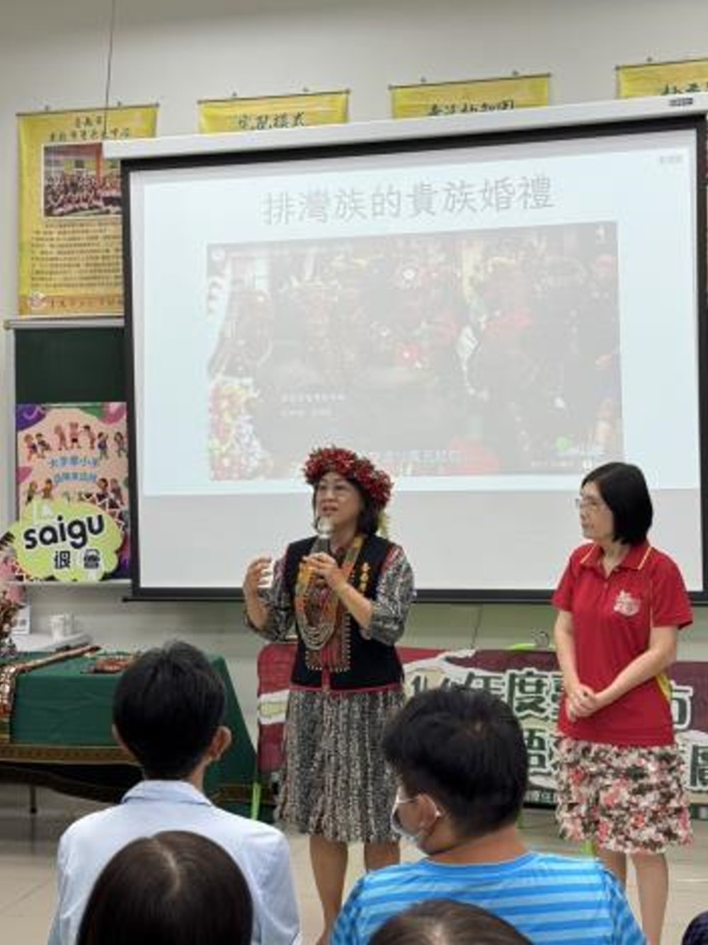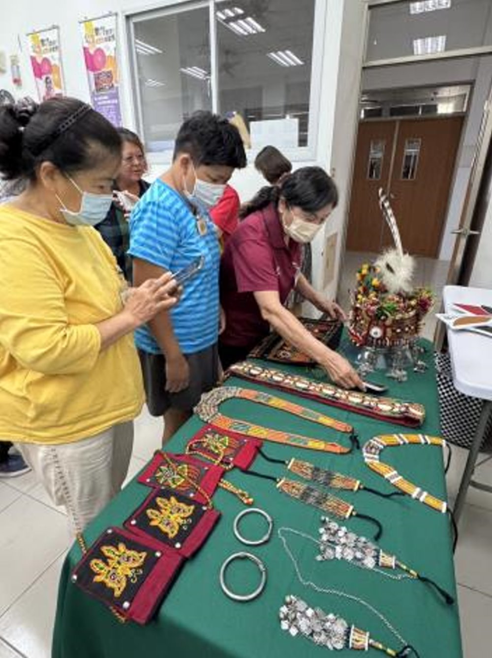 活動亮點之一是講師親自穿戴排灣族傳統婚禮服飾,讓現場長者能近距離欣賞精緻的織紋與服飾細節,並透過實體展示,感受原住民族服飾中蘊含的歷史與文化意涵。現場互動熱絡,可見長者們對於婚禮儀式中的制度與服飾規範具有濃厚興趣。