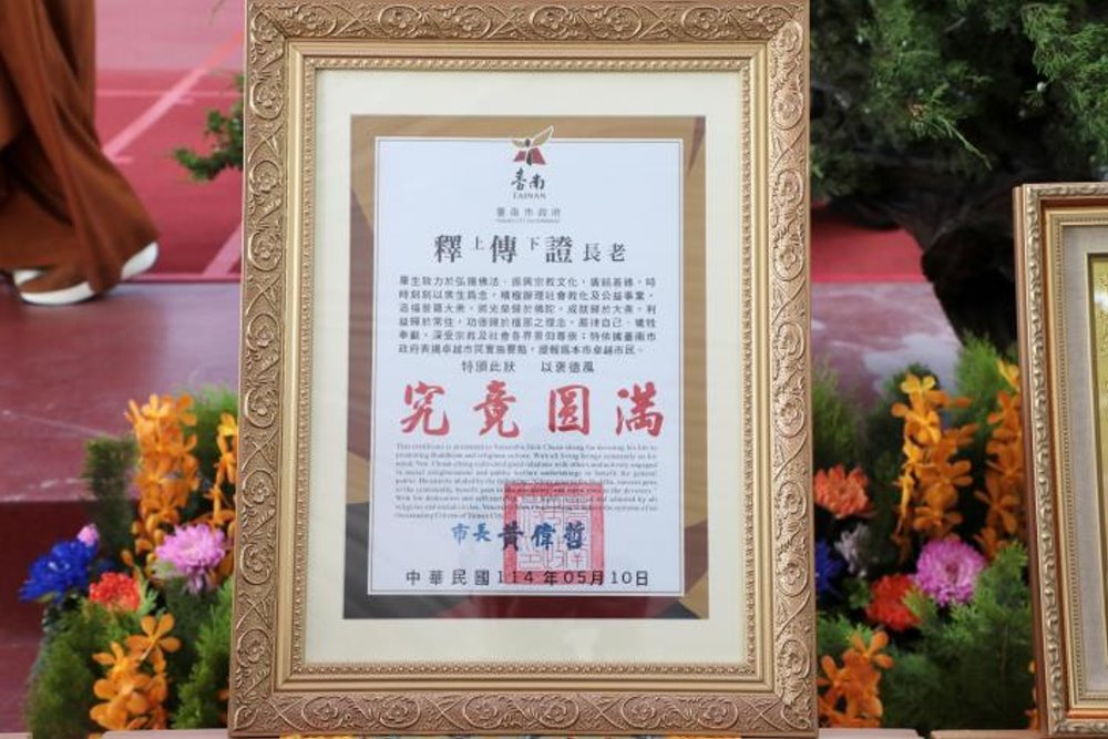 【記者黃石泉/台南報導】財團法人大仙寺第十一任住持傳證老和尚圓寂讃頌大典,今(10)日上午於大仙寺莊嚴舉行。儀式現場肅穆隆重,眾弟子與各界信眾齊聚一堂追思緬懷。國策顧問康銀壽代表賴清德總統頒贈褒揚令,台南市長黃偉哲亦親頒「卓越市民表揚狀」,感念其對宗教文化與地方社會的深遠影響。