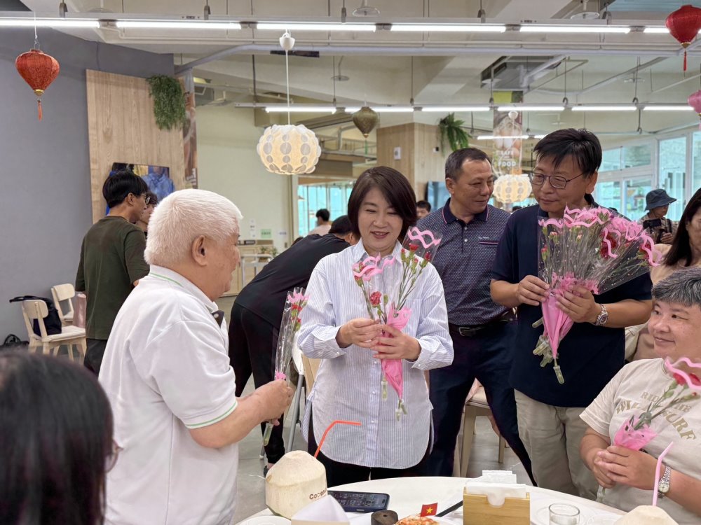 接著,周縣長前往物產館一樓參加產地餐桌系列活動,欣賞來自萬丹的越籍新住民帶來的傳統舞蹈表演,同時也品嚐由屏東農產入菜的越南特色料理,並與現場民眾互動,贈送象徵祝福的康乃馨,為母親節獻上溫馨祝福。周縣長說,屏東物產館將在5月起至11月,每月的第二週舉辦市集及設宴,將屏東在地食材結合異國料理,盼透過美食推廣屏東農產,歡迎民眾前來體驗屏東農產從田間到餐桌的美味旅程。