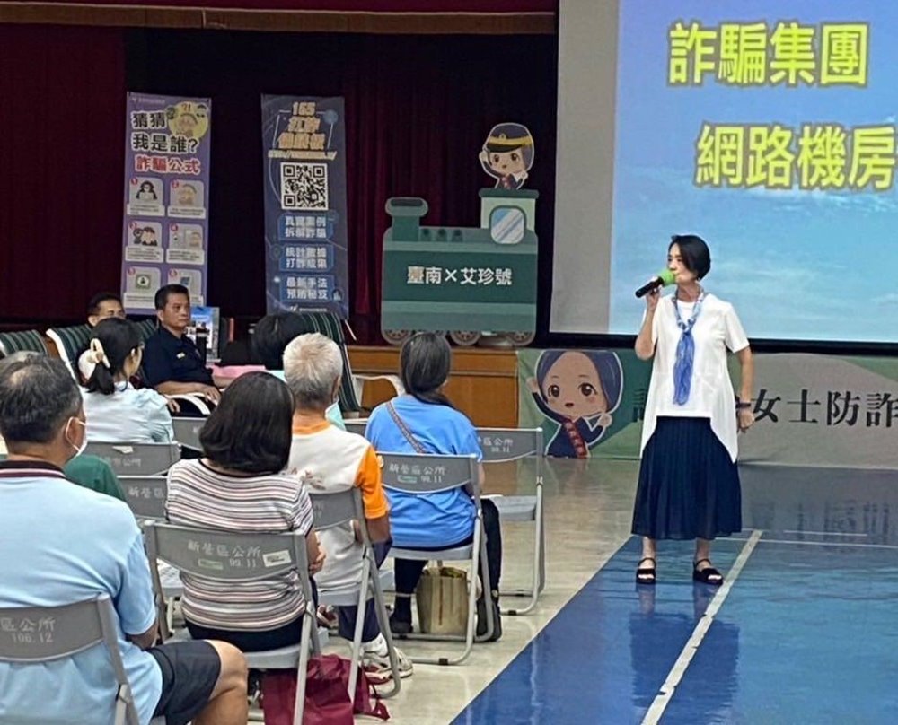 譚艾珍女士現身說法,是希望透過她得影響力與真實經驗,針對高年齡長者及退休人員易遭詐之高風險族群加強假投資、假檢警等高發詐欺手法宣導,活動由新營分局主辦,新營區區長陳宏田、市議員蔡育輝、市議員李宗翰助理、市議員沈家鳳副執行長、市議員王宣貿助理、賴惠員執行長、林俊憲立委秘書、陳亭妃立委秘書、新營區各里里長及民眾約200人,特別規劃「防詐 Q&A 有獎問答」、「打詐儀錶板介紹」及「真實案例解析」等單元,透過簡明易懂的方式,強化民眾對最新詐騙手法的認識,包括假投資、假檢警、網路購物與交友詐騙等常見案例。