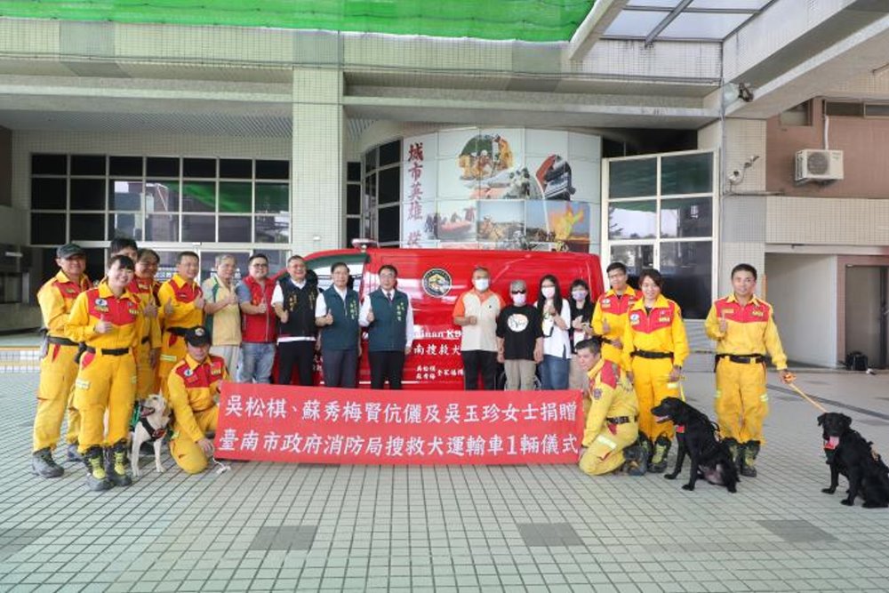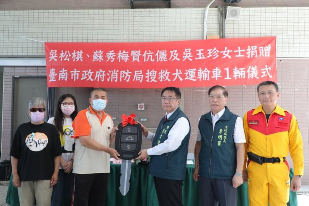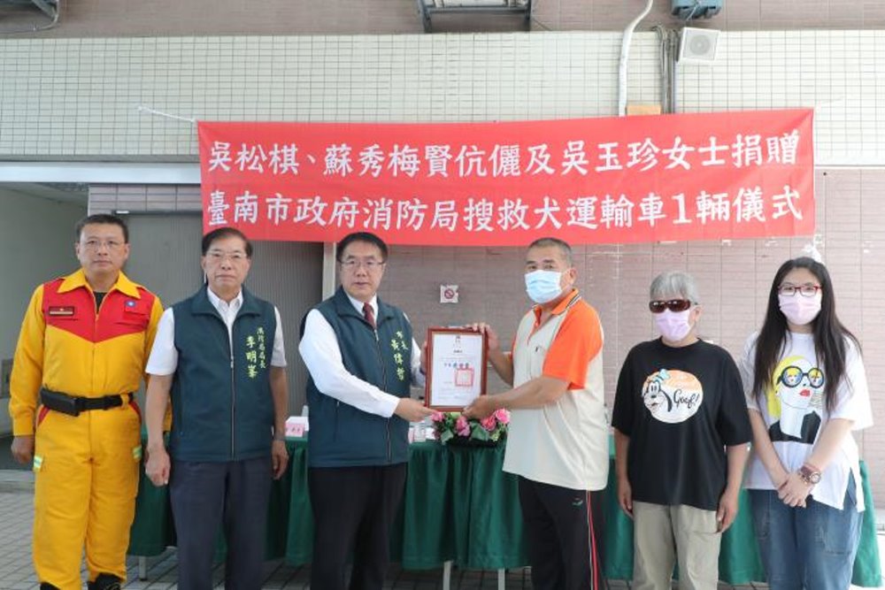 【記者田進山/台南報導】有感於搜救犬執勤艱辛及培訓不易,台南市民吳松棋、蘇秀梅及吳玉珍共同捐贈台南市政府消防局1輛搜救犬運輸車,今(21)日舉辦捐贈儀式,由台南市長黃偉哲親自出席受贈並回贈感謝狀,感謝民間在市府財政面臨壓力時伸出援手,協助強化救災應變能量。