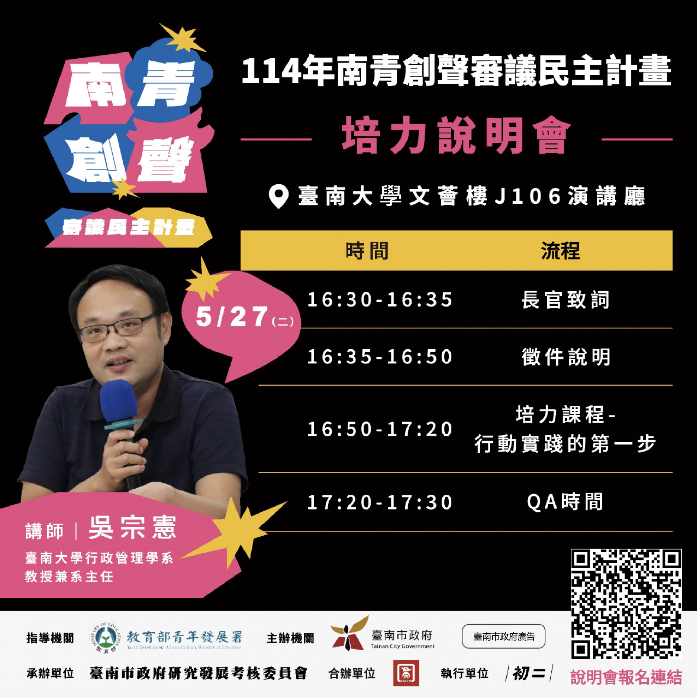 另於活動中特別邀請國立臺南大學行政管理學系系主任吳宗憲教授以「淺談審議民主」為題進行專題演講,引導青年理解審議民主的核心價值與提案邏輯,提升提案的可行性與政策實作能力。