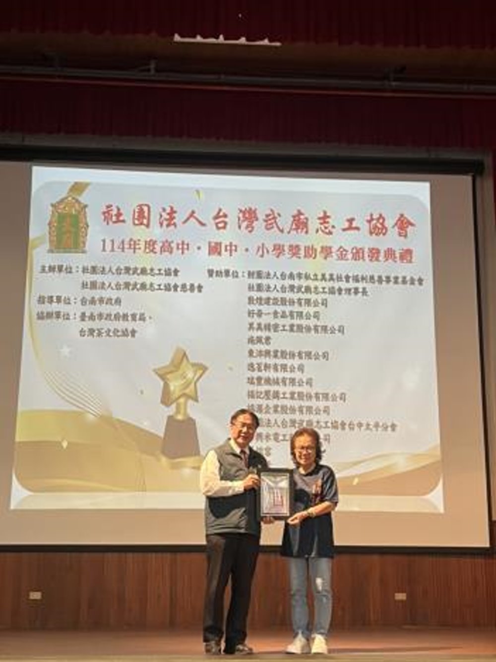 圖:台灣武廟志工協會頒發114年度獎助學金市長黃偉哲頒贈感謝狀(記者黃石泉攝)