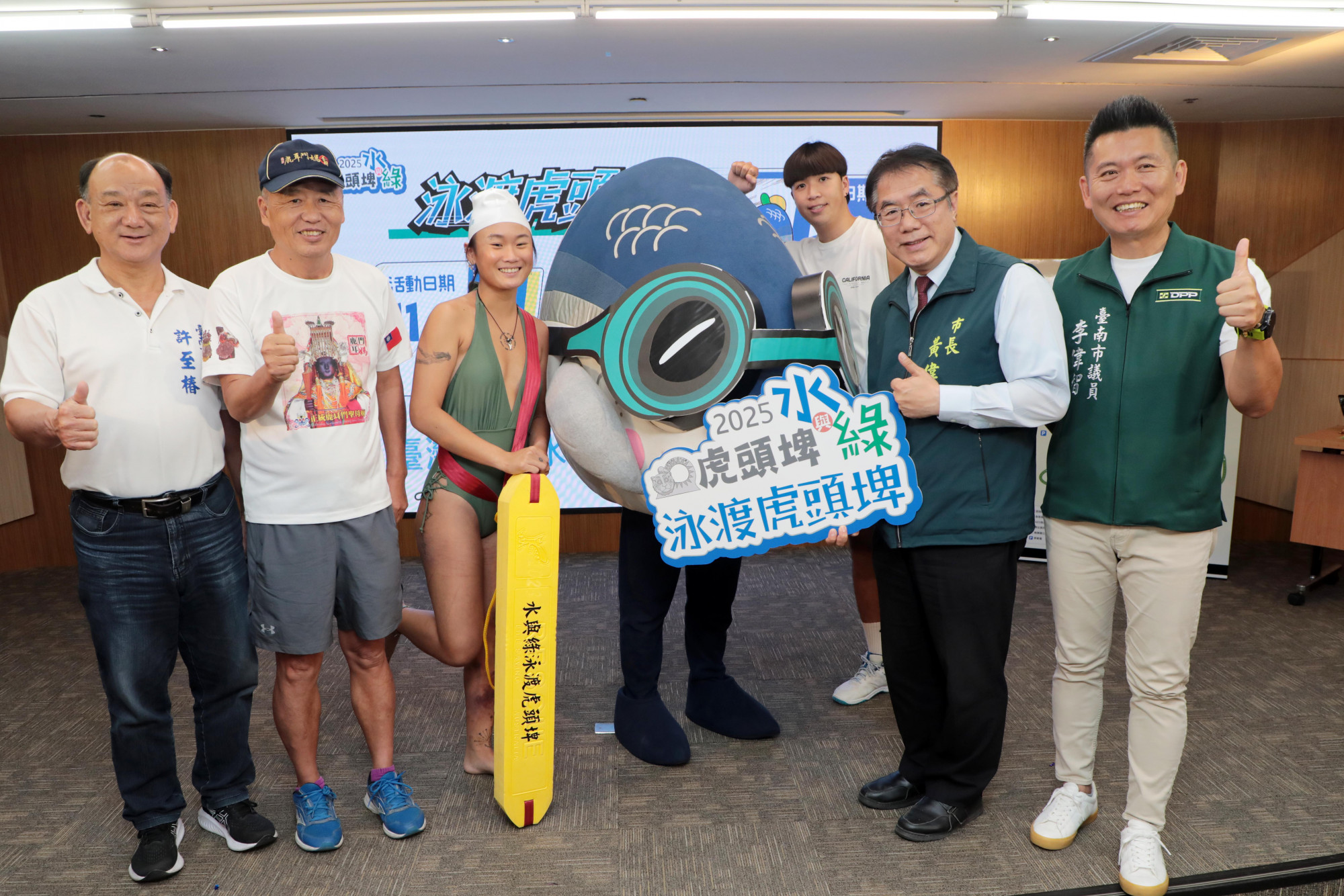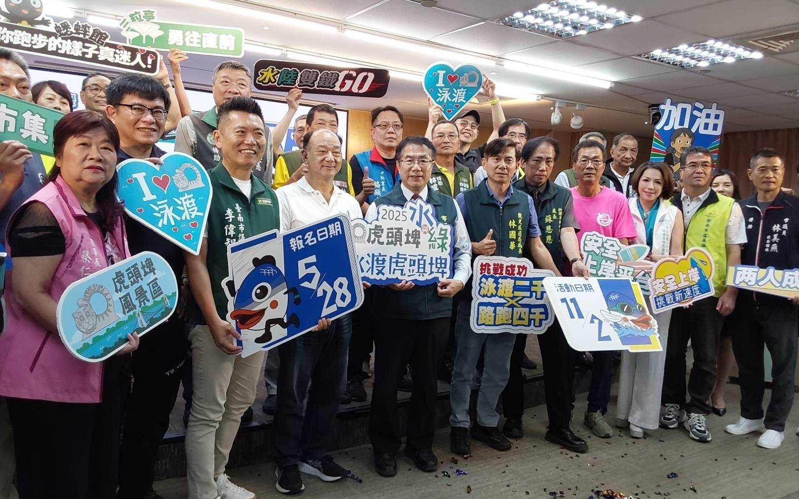 南台灣唯一水陸鐵人挑戰 「2025泳渡虎頭埤」將在今(114)年11月2日登場,即日起開放民眾報名參賽。台南市長黃偉哲今(28)日出席宣傳記者會,現場更邀請到台南榮譽市民「鐵人阿伯」蔡明宜到場,邀請勇於挑戰自我的民眾踴躍報名。市議員許至椿、李偉智、Ingay Tali穎艾達利,以及立委陳亭妃、林俊憲辦公室代表均到場表達支持。