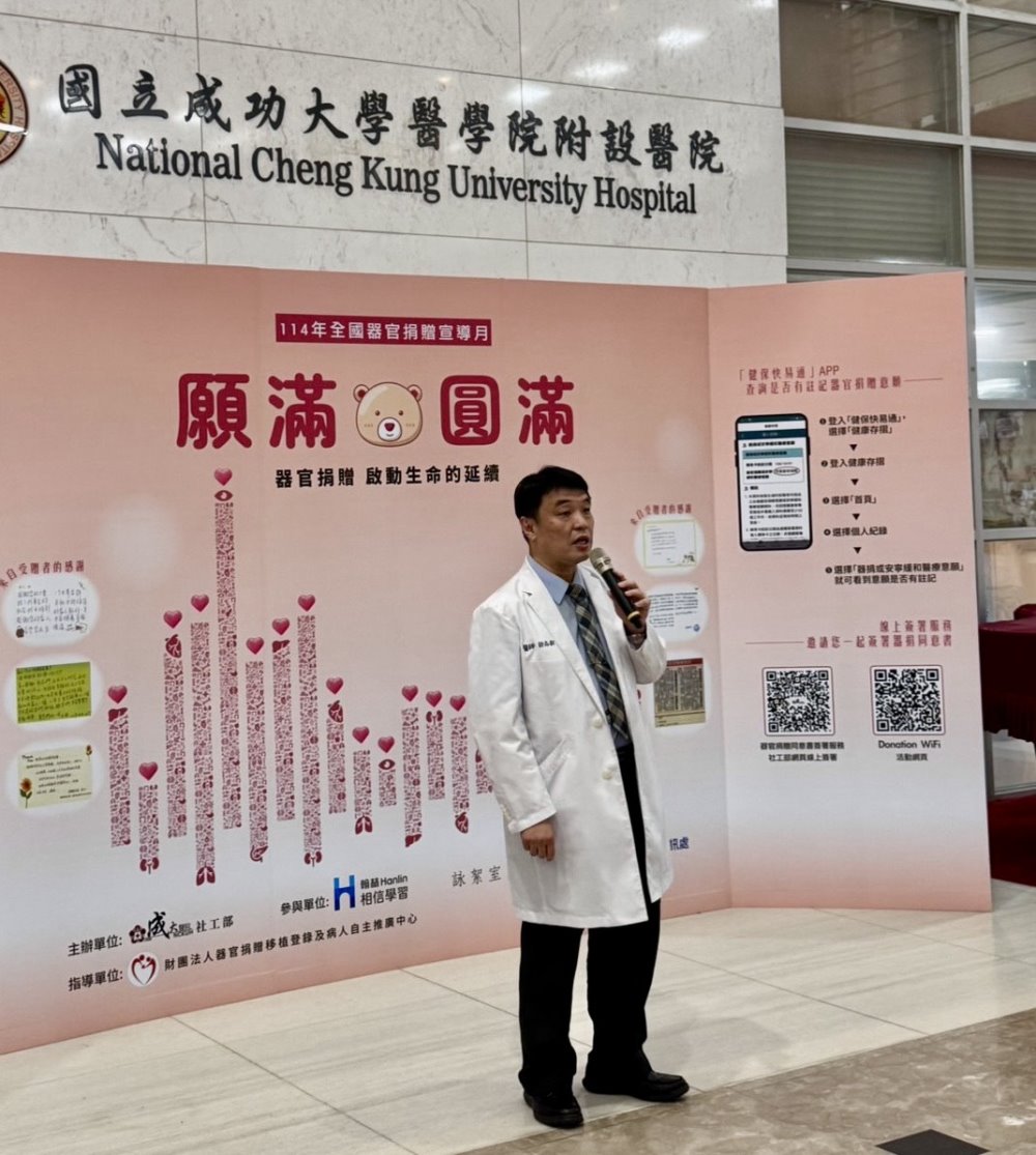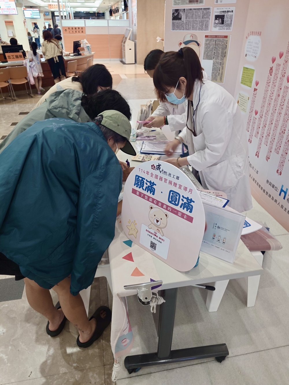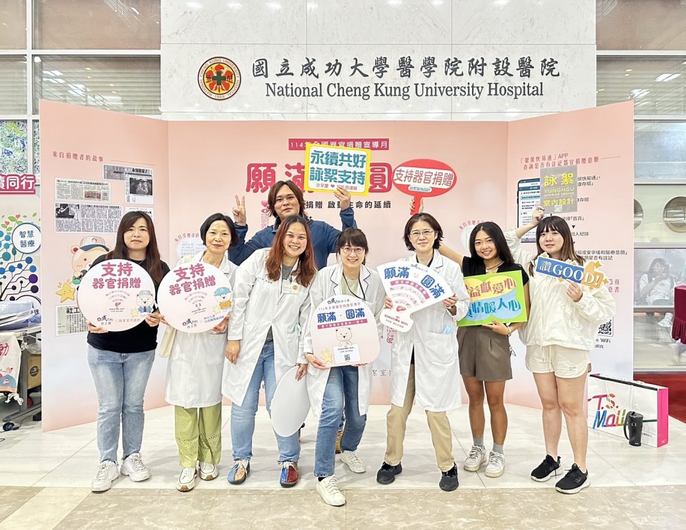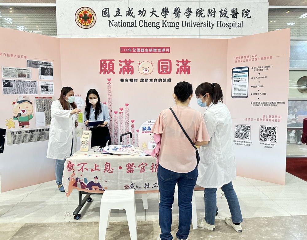 114年6月16日至6月20日,成大醫院於門診大樓一樓大廳舉辦「器官捐贈宣導週」活動,活動現場有介紹捐贈者故事、受贈者現身說法感謝捐贈者無私的大愛,讓自己重獲新生、教導如何線上查詢器捐註記意願以及衛福部線上註記,由社工師全程提供專業諮詢及簽署服務,鼓勵民眾參與FB打卡響應,分享更多愛與希望的感動。