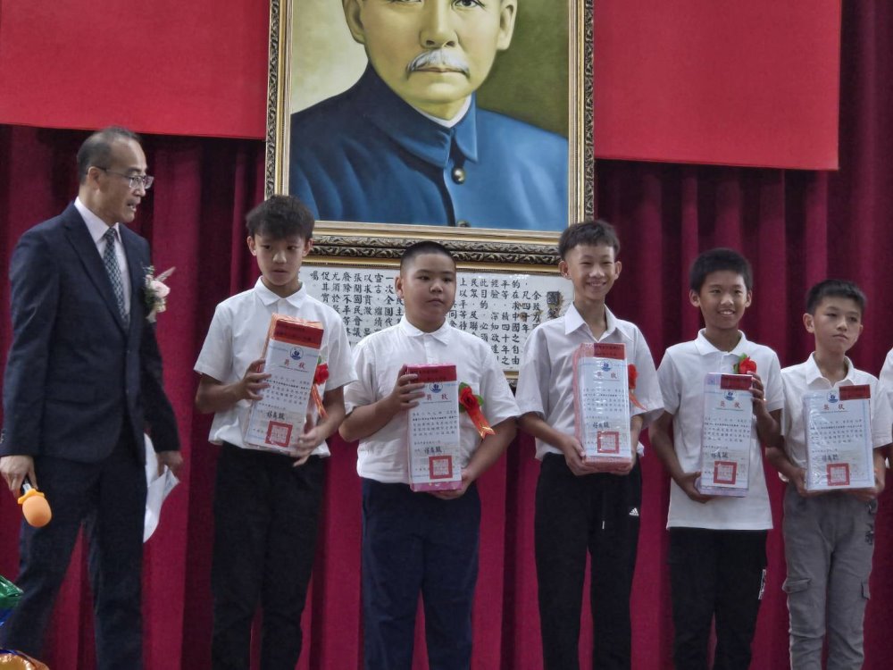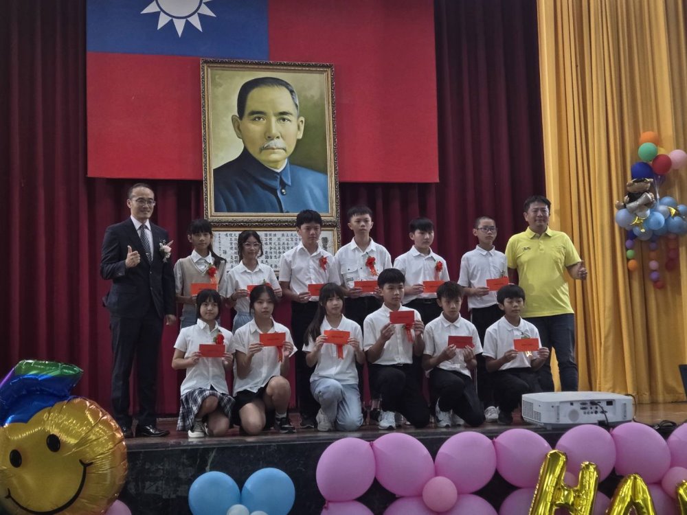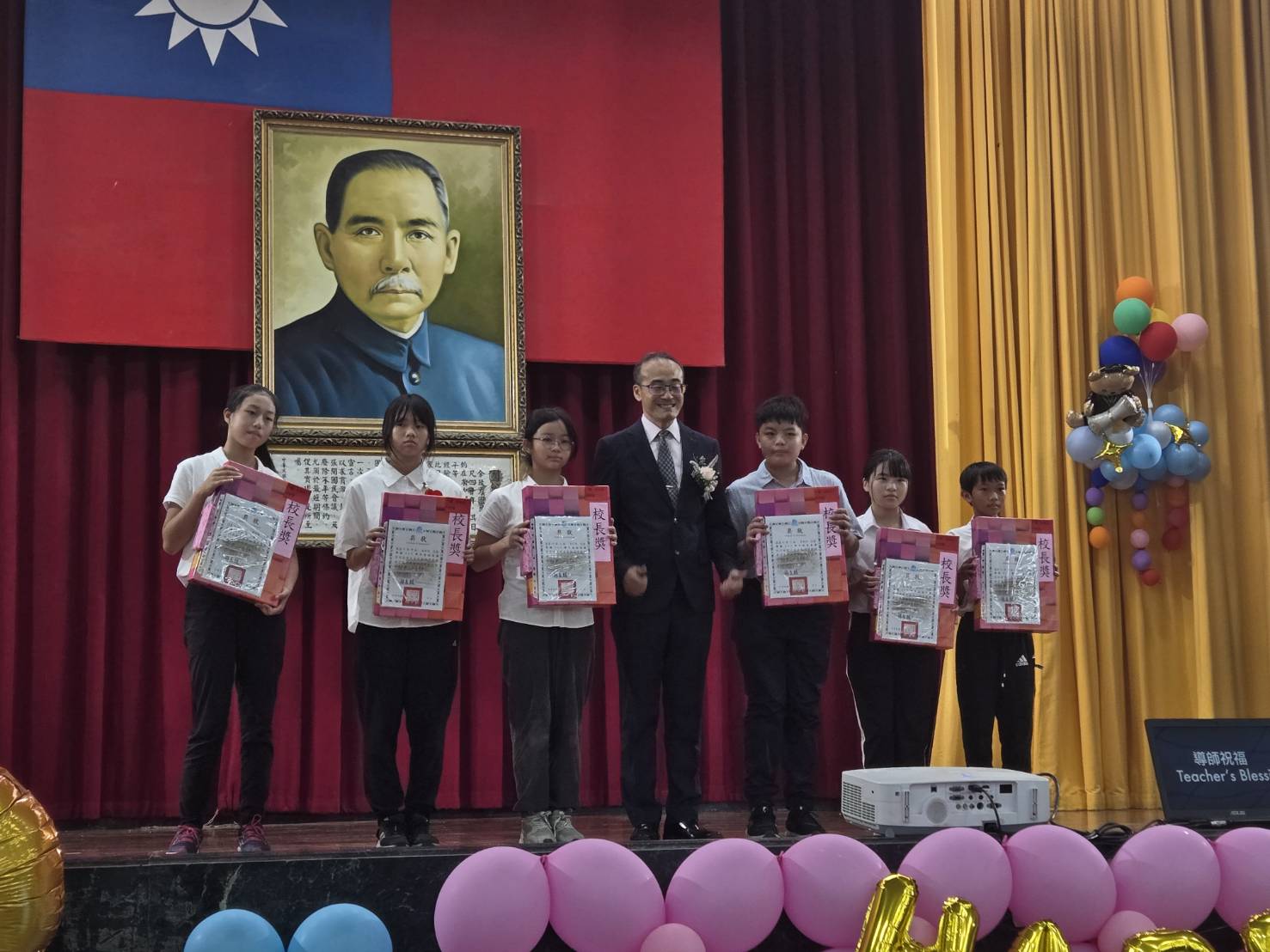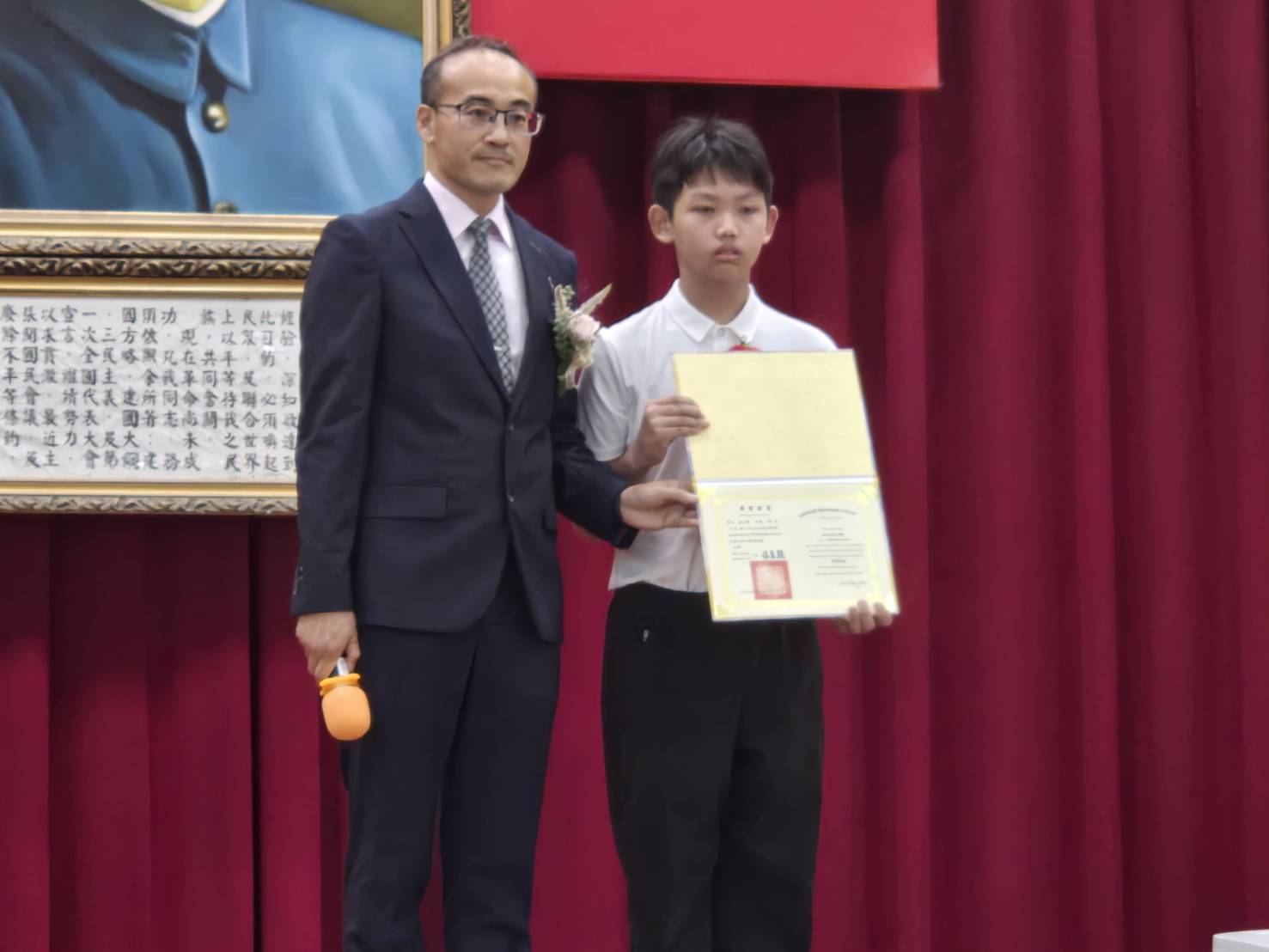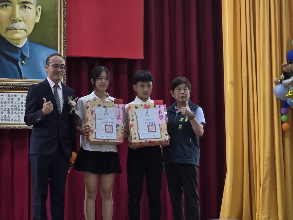 台南市長優學獎獲獎同學分別為六甲謝帛均、六乙張耘慈及六丙林子晴等三人,受獎的同學均充滿歡喜上台領獎並與頒獎來賓合照,留下美麗的倩影及印記。
