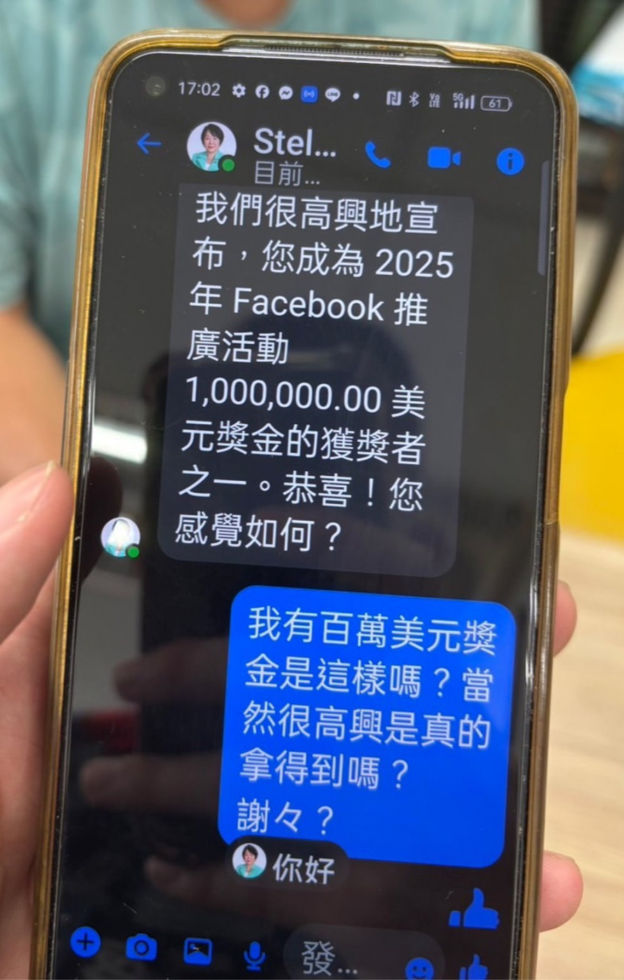 【記者田進山/台南報導】台南市善化區郭姓民眾於本(6)月20日在通訊軟體Messenger上,收到臉書帳號名為「Stelion le」的神秘用戶發送一則「恭喜您成為2025年Facebook推廣活動1百萬美元獎金的獲獎者之一」訊息,聲稱郭姓民眾是Facebook現金促銷活動的「超級幸運得主」,中獎高達100萬美金的獎金,並稱要領取獎金,得先支付新台幣5萬元的手續費,為了幫助郭姓民眾更方便匯款,還貼心建議他可以分批購買蘋果禮品卡當作支付方式。