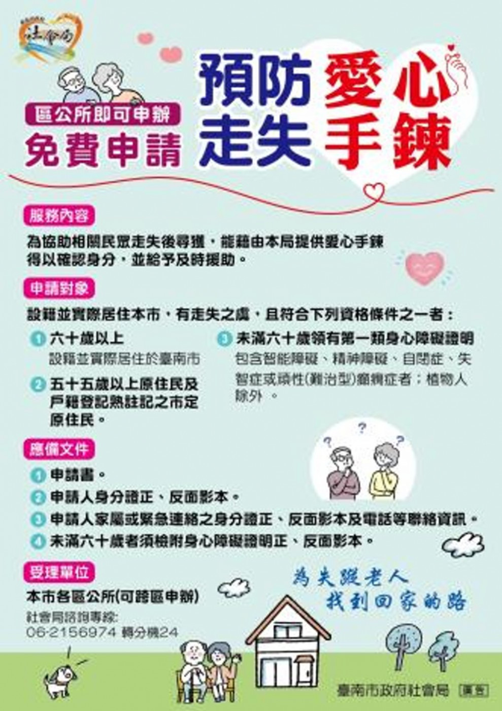 【記者廖啓舟/台南報導】為積極預防有走失疑慮市民流落街頭,社會局有辦理「預防走失-愛心手鍊」之申請服務,此項福利能讓走失之長者及身心障礙者藉由手鍊上的資料,經警方確認身分而協助返家。故若本市民眾有60歲以上有走失之虞長者及未滿60歲領有第一類身心障礙證明者、55歲以上原住民以及戶籍登記熟註記之市定原住民,皆可至戶籍所在地區公所申請免費愛心手鍊。