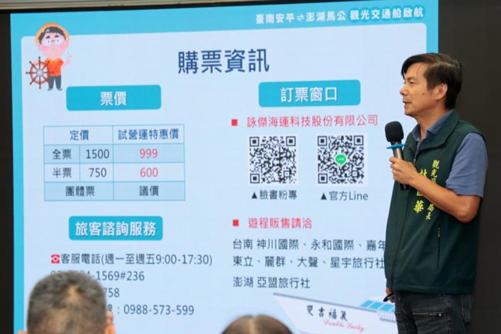 【記者廖啓舟/台南報導】暑假熱門旅遊旺季即將開始,為發展跳島旅遊多元遊程及拓展海洋永續觀光,台南市政府將於今(114)年7月8日開展台南安平至澎湖馬公觀光交通船航線,採取每週兩班固定航班,分別於週二與週五各1班往返,由安平港出發直航馬公港,全票原價1500元,試營運特惠價999元,半票600元。今(26)日舉辦活動宣傳記者會,市長黃偉哲表示,台南澎湖跳島遊程不僅可讓台澎兩地旅客往返多一項便利選擇,更可帶動海洋觀光新型態遊程的開發,非常歡迎國內外旅客一起來體驗暢遊。