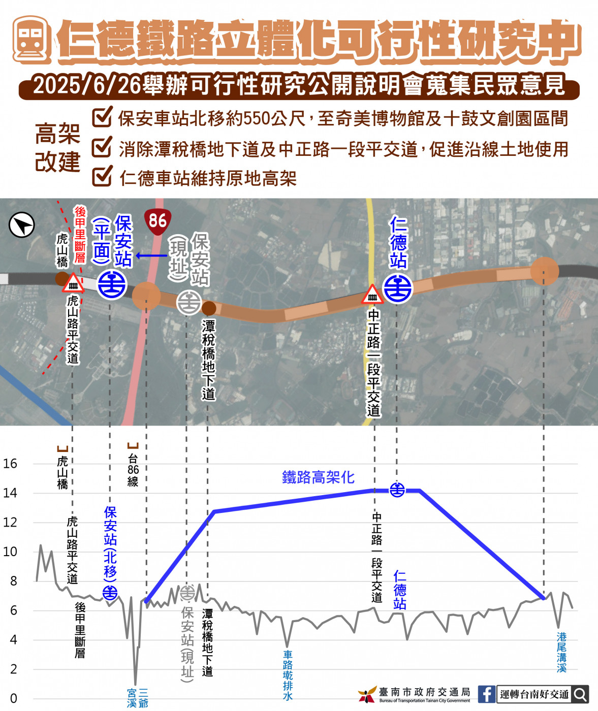 交通局表示,專業規劃團隊依據「鐵路平交道與環境改善建設及周邊土地開發計畫審查作業要點」,針對工程技術、交通改善、經濟效益、財務等面向進行分析評估,仁德區鐵路採高架改建較為可行,高架範圍北端起自台86線高架橋下,南端至港尾溝溪,長約2.6公里,沿線可消除潭稅橋地下道及中正路平交道,惟因現有保安車站位於鐵路高架斜坡路段,須配合將保安車站北移,車站新址規劃於奇美博物館及十鼓文創園區之間,距車站現址約550公尺,後續車站可更新優化,提供當地更便利之公共運輸服務,現有之保安車站因屬市定古蹟,規劃將原地保留後續可朝文化觀光用途發展。另仁德車站則可維持原地高架,鐵路立體化總經費初估約104億元。