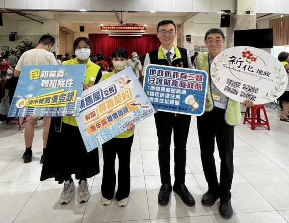 【記者黃石泉/台南報導】依據內政部警政署統計臺南市5月詐騙案件受理數從4月的1,232件增加到1,299件,為六都增加最多。為合力協助民眾守護財產安全,新化地政事務所於6月28日結合轄區內新市白蓮霧節─「閃耀綠寶石傳說」產業文化活動設攤宣導,本次宣導主軸「防詐三寶」—地籍異動即時通、住址隱匿、指定送達處所,以及推廣電子產權憑證、地籍存摺等地政服務,現場提供地籍異動即時通申辦服務,並設計轉轉圓盤活動與民眾互動,加深民眾的不動產防詐觀念,提高地政便民服務的能見度。