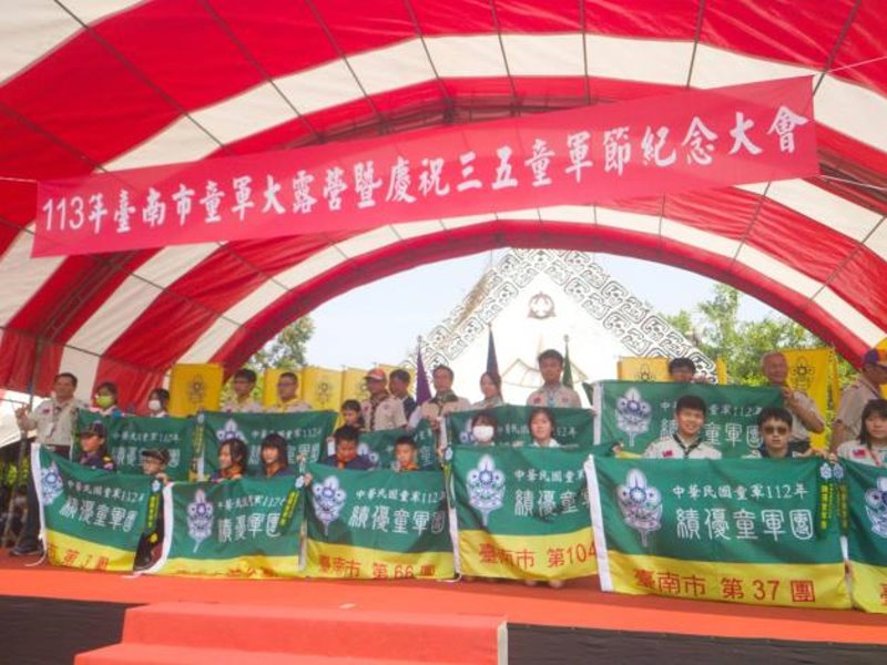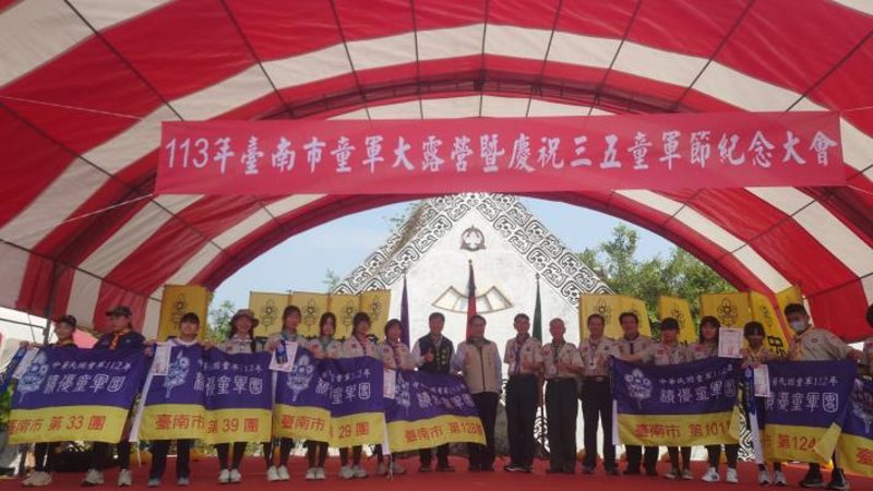 【記者廖啟舟/台南報導】為慶祝三五童軍節,發揚童軍精神與技能,臺南市童軍會今(16)日在烏山頭水庫珊瑚潭舉行慶祝儀典與全市大露營,也為7月將在臺南舉辦的全國大露營暖身,共31校團約800人參與。臺南市黃偉哲市長親臨現場同慶,並表揚7個童軍總會績優團、11個本市績優團、吳兆棠博士獎學金9名、優秀童軍62名,各級獎章得獎者24位。