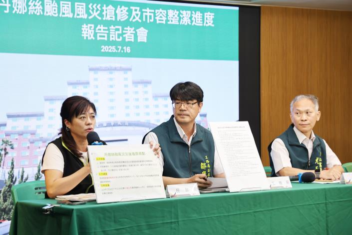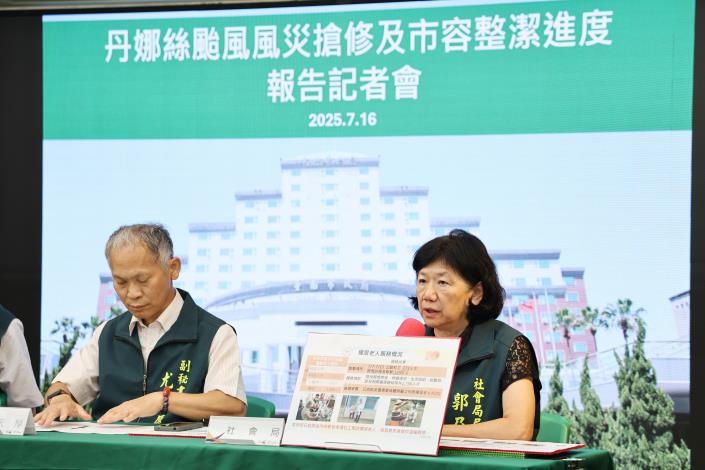 針對台南市各項災後復原工作進度,民政局說明,截至昨(15)日,丹娜絲風災屋頂受損的家戶共10,935戶,有7,957戶已鋪設帆布完成,尚有2,978戶待處理,也特別感謝屏東縣、高雄市投入共464位人力,國軍投入3,291人、替代役2,280人,台南市投入防災士、義警民防、義消等共3,703人,里志工18,286人及慈濟3,777人等,支援台南市災後復原工作,包括農損清運、道路清障、建物整理、鋪設帆布以及受理民眾補助申請。