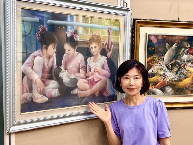 秘書處指出,傳統粉彩畫作品多以風景、靜物或人物肖像為主,當代畫家則嘗試將粉彩運用於抽象畫作,展現出創新的視覺效果。這次展出作品「等待」,畫家捕捉三位小芭蕾舞者在等待表演間隙的溫馨時刻,畫面洋溢童真與純潔的美好。畫家掌握粉彩的柔軟特質,以細膩筆觸描繪三個小女孩的不同神態,左側的女孩專注凝視中間女孩低頭整理舞裙,右側金髮女孩則天真地望向觀者,每個人物表情生動。