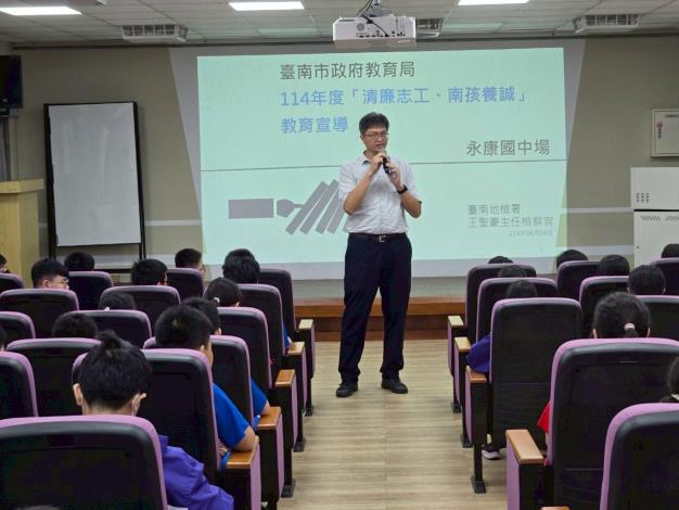 【記者田進山/台南報導】為使法治觀念與誠信精神從小扎根,臺南市政府教育局辦理「廉潔政府與誠信價值公民講堂」系列活動,臺南地方檢察署主任檢察官王聖豪8月4日化身「行動公民課本」走進永康國中,結合國中課綱內容將刑法、民法及時事案例帶到課堂,把艱澀的法律變成有趣的生活時事,並帶入誠信與廉潔的重要性,吸引全校近200名師生聽得聚精會神。