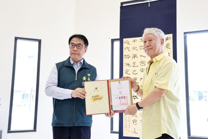 【記者華民鳳/台南報導】丹娜絲颱風重創台南造成農漁產業及民宅嚴重損失,知名藝術家蔣勳深感災情慘重,在第一時間表達支援意願,同時無償捐出書法作品《金剛經》立軸乙幅進行義賣,盼為災後重建盡一份心力。今(5)日於新營文化中心舉行捐贈儀式,市長黃偉哲親自出席並回贈感謝狀,感謝各界公私協力互助,共同為災後復原盡心盡力。