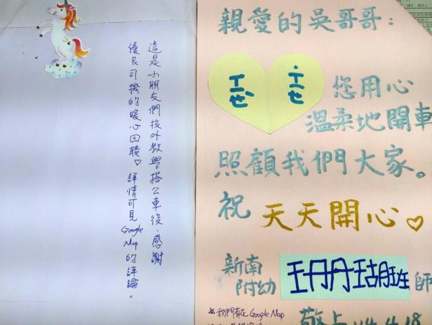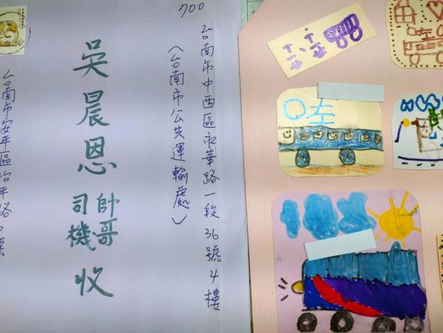 【記者陳岑博/台南報導】公共運輸處近日接獲新南國小附幼的老師及小朋友們親手繪卡要向駕駛長吳晨恩大哥哥表達謝意,原來是學校選擇日常生活中常見的公車作為校外教學的交通方式,讓小朋友除了學習搭乘公車上車前要先招手、下車要按鈴、及搭車要刷卡等乘車基本禮儀外,對於0左路的公車駕駛親切招呼與開車平穩,更是讓師生們印象深刻,見證駕駛良好的身教,給予五顆星好評!