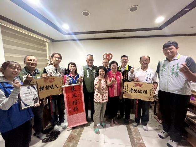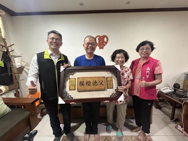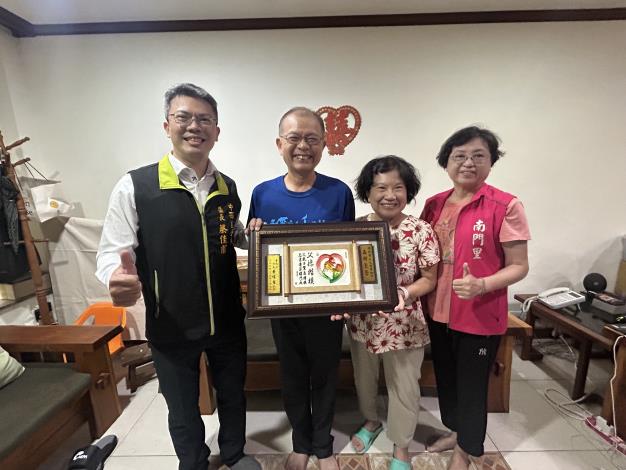 【記者楊朝欽/台南報導】父親節前夕,台南市中西區蔡佳甫區長代表黃偉哲市長、民政局姜淋煌局長及多位民意代表,於8月7日親自向今年接受市政府表揚的晶鑽爸爸-南門里鐘俊賢先生致贈紀念匾額,表達祝賀之意。