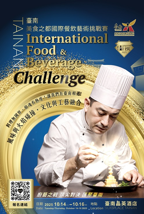 觀光旅遊局表示本次賽事將於2025年10月14日(星期二)於臺南晶英酒店隆重登場,活動歷時三天(10月14日至16日),預計吸引來自世界各地的廚藝好手齊聚臺南,共同角逐榮耀。比賽項目類別多元,涵蓋烘焙藝術、創意飲品調製、靜態展示、餐酒料理等領域,參賽者可依照自身專長選擇適合項目,增添競賽趣味性與挑戰性。歡迎臺灣及國際餐飲職人、烹飪達人踴躍報名參與,發揮創意、展現廚藝,角逐榮耀!即日起開放報名至9月28(星期日)截止,報名簡章與詳細資訊,請至活動官網查詢下載或至活動報名網頁報名參加。更多最新的臺南觀光景點與活動,請持續關注「台南旅遊網」及「台南旅遊粉絲專頁」查詢。