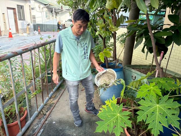 為加強登革熱防治工作,區公所持續進行登革熱衛教宣導及積水容器、孳生源巡檢、清除工作,並配合「環境清潔日」活動,協請里、鄰長及志工伙伴進行孳生源清除、積水容器巡查、清除及家戶宣導等工作,以落實孳生源清除工作,同時籲請家戶配合清除住戶室內戶外積水容器,發現廢棄容器,配合環保局清運回收處理,閒置容器倒置或加蓋,避免積水形成孳生源環境,做好登革熱防治工作。