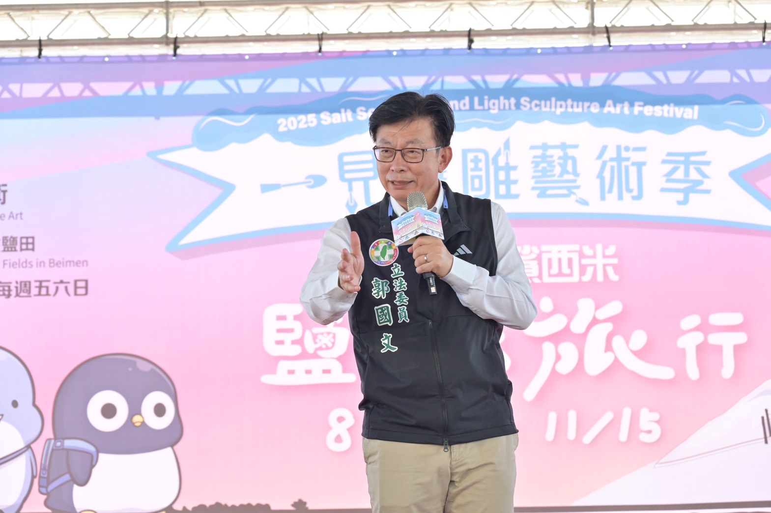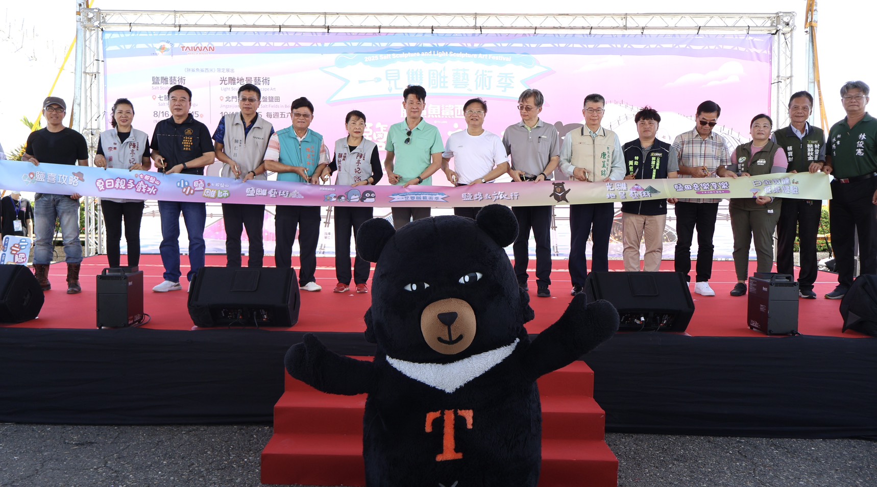 由交通部觀光署雲嘉南濱海國家風景區管理處(以下簡稱雲嘉南管理處)主辦的「2025一見雙雕藝術季」8月16日在臺南七股鹽山盛大展開,帶來全臺唯一融合鹽雕與光雕的夏日藝術盛會。今年以LINE貼圖人氣明星《胖鯊魚鯊西米》家族為主角,化身雲嘉南夏日導覽員,邀請大小朋友沿著台61線幸福公路,進入鹽鄉的沉浸式藝術旅程。開幕式上午10點於七股鹽山舉行,由郭國文立法委員、林俊憲立法委員服務處代表、陳亭妃立法委員服務處代表、賴惠員立法委員服務處代表、交通部觀光署黃勢芳副署長、方一峰議員、陳昆和議員、蔡秋蘭議員、蔡蘇秋金議員服務處代表、謝舒凡議員服務處代表、交通部觀光署雲嘉南濱海國家風景區管理處徐振能處長、臺鹽實業股份有限公司李杰翰副總經理、台灣守護文創股份有限公司陳仁昌董事長、中華民國旅館商業同業公會全國聯合會洪崇元理事長、臺南市政府觀光旅遊局唐呈瑞簡任技正、北門蚵寮保安宮洪明農主任委員及觀光相關協會理事長及業者等多位貴賓蒞臨,共同為2025一見雙雕藝術季鹽雕藝術展揭開序幕。