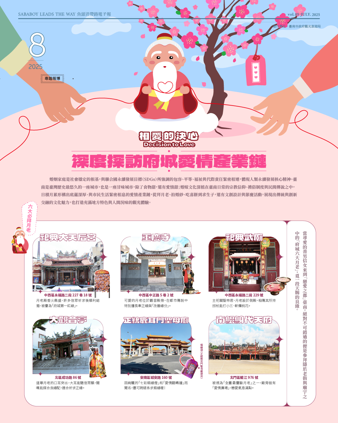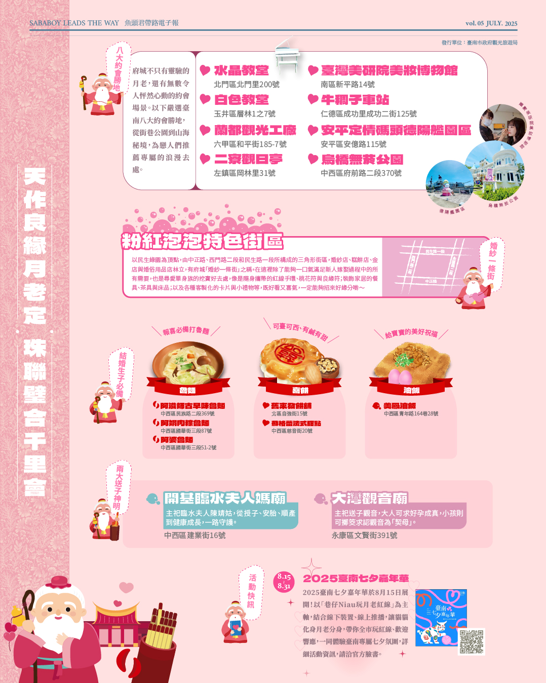 南市觀旅局林國華局長表示,八月號的《魚頭君帶路》推出從求姻緣、談戀愛、論嫁娶、求生子一系列的介紹。來到臺南旅行的善男信女,千萬別錯過參拜隱身於老街與廟宇之中的「府城六大月老」,尋覓一段天賜的良緣、走訪網友精選出的八大約會勝地及臺南婚紗特色街區、品嚐結婚生子必吃的特色美食、參拜送子神明廟宇,親身體驗臺南特有的愛情產業鏈文化。另臺南市政府文化局「2025臺南七夕嘉年華」活動於8月15日起開跑,以「巷仔Niau玩月老紅線」為主軸,透過線下裝置及線上推播,讓貓貓化身月老,帶大家全臺南市玩紅線,一同體驗臺南獨有的七夕氛圍。