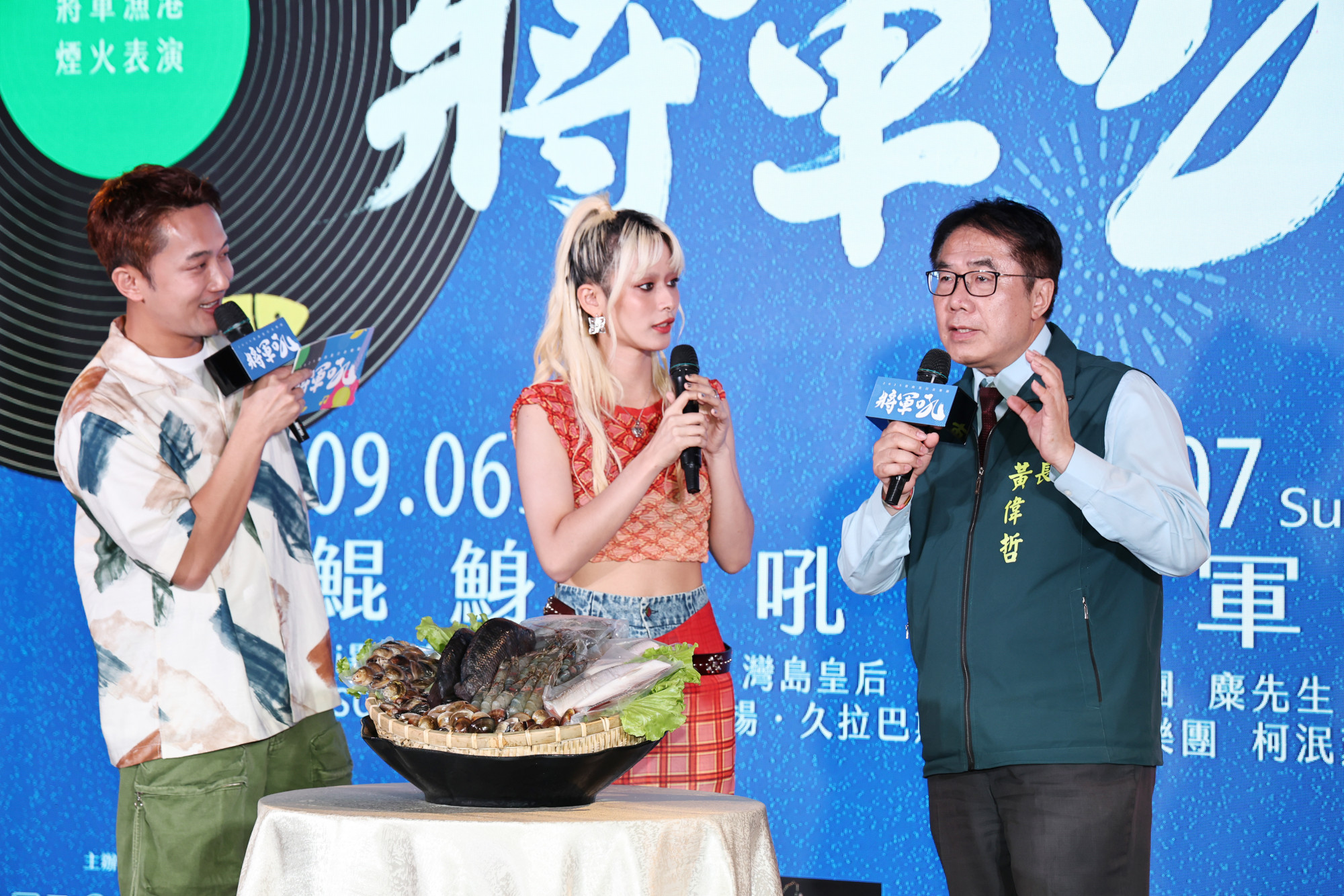 今日記者會開場,邀請入圍金曲獎最佳新人、與台南淵源深厚的JUD陳泳希,以空靈迷幻的歌聲為活動暖身。市長黃偉哲特別致贈「台南新鮮海味組合」給陳泳希,包含虱目魚、文蛤、台灣鯛、白蝦等代表性漁產,強調台南漁產新鮮、品質佳、口碑好,誠摯邀請民眾親臨將軍漁港,品味台南最道地的海鮮滋味。