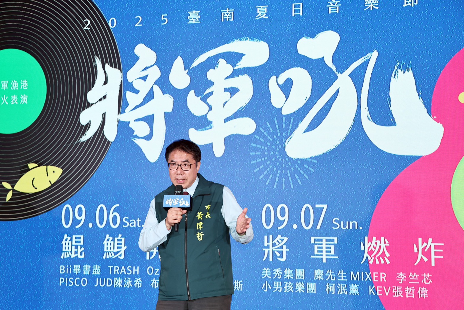 南台灣最受矚目的夏季音樂品牌「2025台南夏日音樂節-將軍吼」,將於9月6日、7日在將軍漁港熱力登場!台南市政府今(27)日舉辦記者會,市長黃偉哲親自蒞臨主持啟動儀式,今年最大亮點之一,是首次施放「16吋煙火彈」,黃偉哲在彈身親筆寫下「台南加油」的祝福,邀請全國民眾相約台南,看煙火、聽音樂、品海鮮,共同抓住夏天的尾聲。