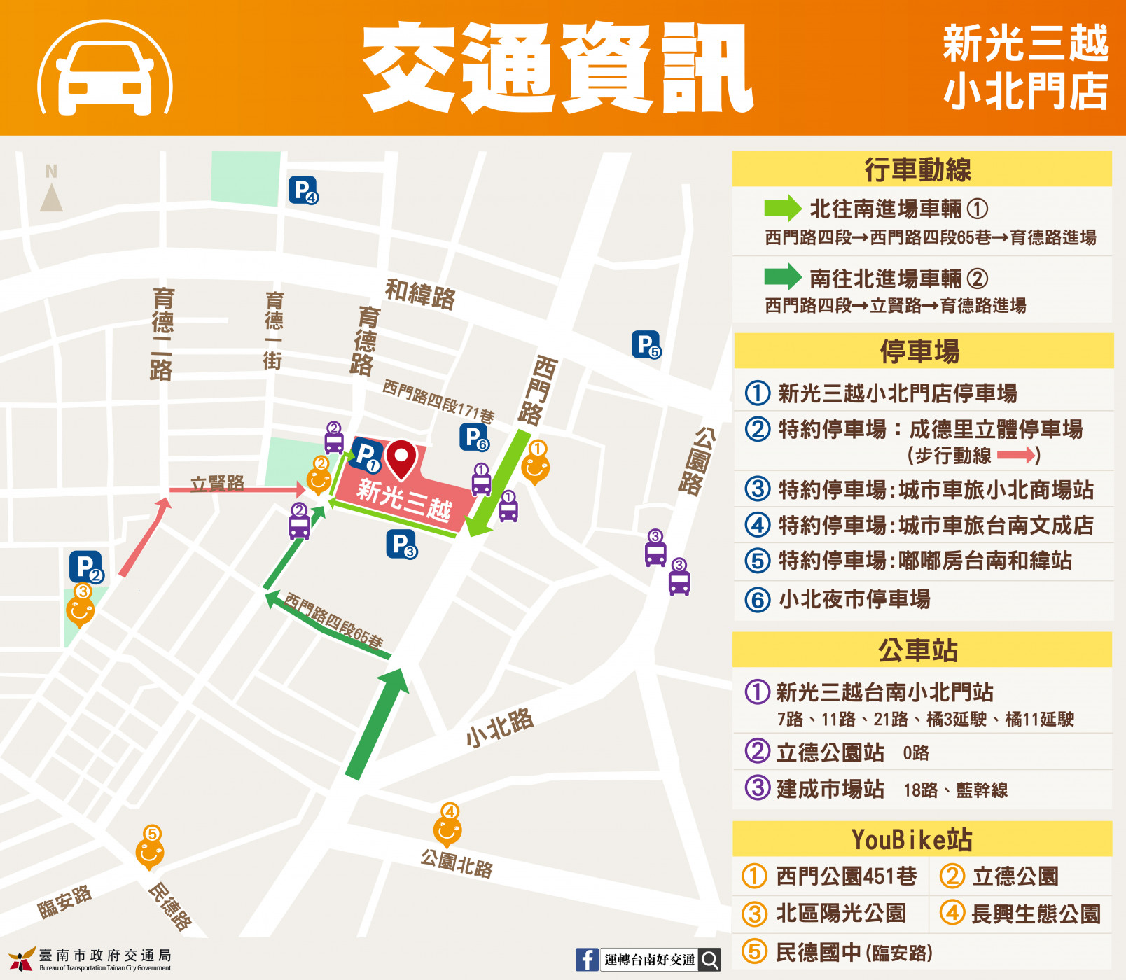 交通局局長王銘德表示,市長黃偉哲就任以來「拼經濟」一直是首要施政重點,新光三越的進駐有望帶來商業人潮,活絡小北商圈,但交通考驗也隨之而來,市長黃偉哲特別要求交通局提早規劃周邊交通動線,其中避免立賢路、育德路受進場車輛影響而回堵,已重新調整車道與規劃,對於車輛疏解效率可達到加乘效果,同時於立賢路上增加計程車招呼站,可供前來消費民眾使用。