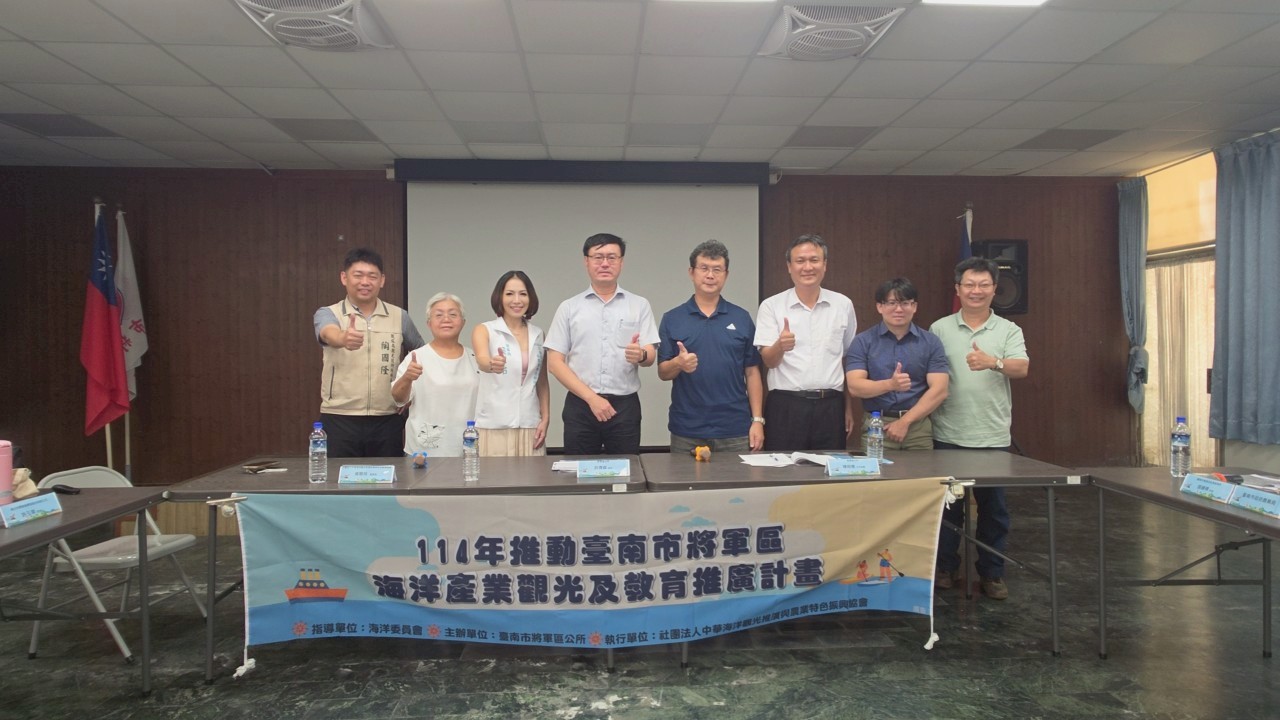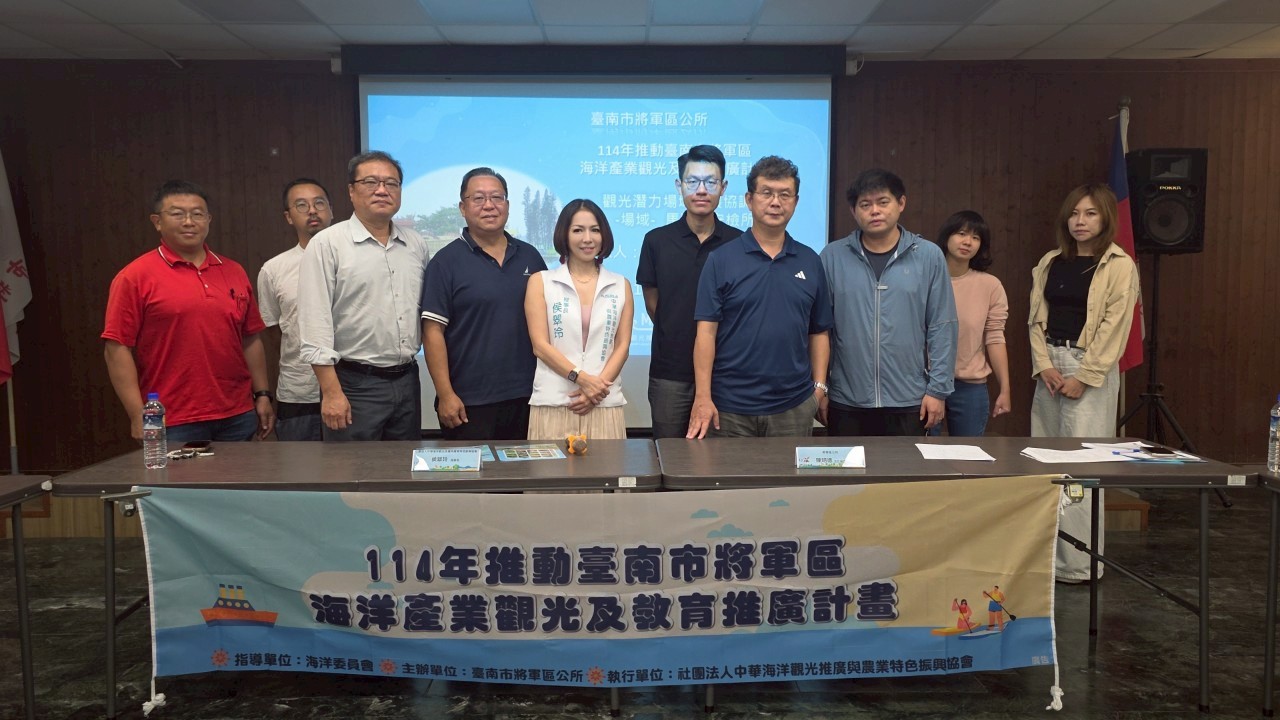 將軍區公所許博森區長表示公所於風災積極重建之餘,同步推進濱海區域住宿型與露營休憩場域布局,盼透過中央與地方協力,加速土地活化與觀光發展進程。左四將軍區公所許博森區長、右四將軍區公所陳明德主任秘書、右三臺南市漁港及近海管理所張順德所長、右二臺南市政府地用科蔡文龍科長、右一臺南市漁港及近海管理所漁港管理組黃國珍組長、左三 社團法人中華海洋觀光推廣與農業特色振興協會侯翠玲理事長、左二 維戈休閒遊艇開發股份有限公司許玉華監察人、左一 臺南市政府觀光旅遊局觀光技術科陶國隆科長。