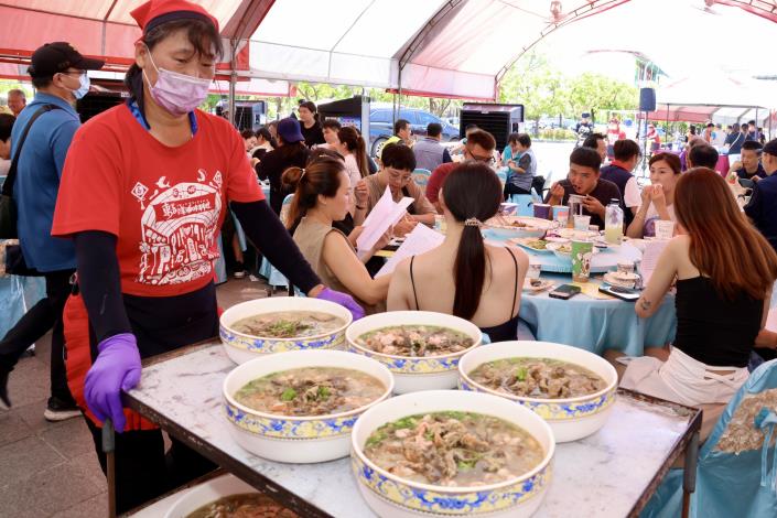 【記者黃石泉/台南報導】「2025台南總舖師四季辦桌夏季場」今(30)日中午於四草大眾廟熱鬧開桌,來自北中南的饕客齊聚一堂,除了品嚐由兩位米其林必比登推介名廚,東香台菜大頭師(蔡瑞成)與筑馨居勇伯(周榮棠)聯手推出的十道精緻手路菜,現場也有說菜、陣頭、古早味的台語唸歌、老歌金曲表演以及有獎徵答等節目,讓來賓在視覺、味覺與文化層面皆獲得豐富體驗。