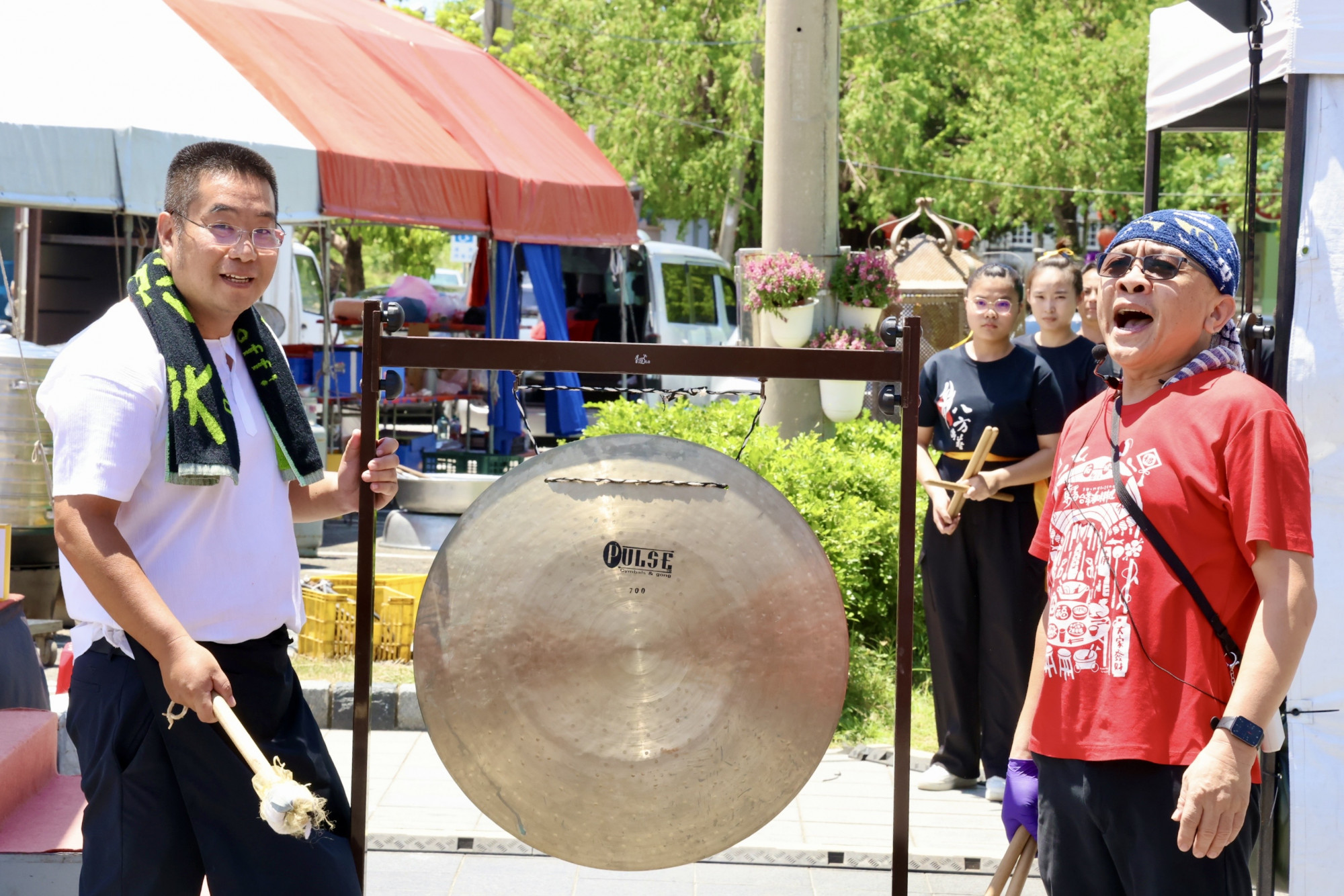 左起大廚勇伯(周榮棠)、大頭師(蔡瑞成)敲鑼開啟今日辦桌