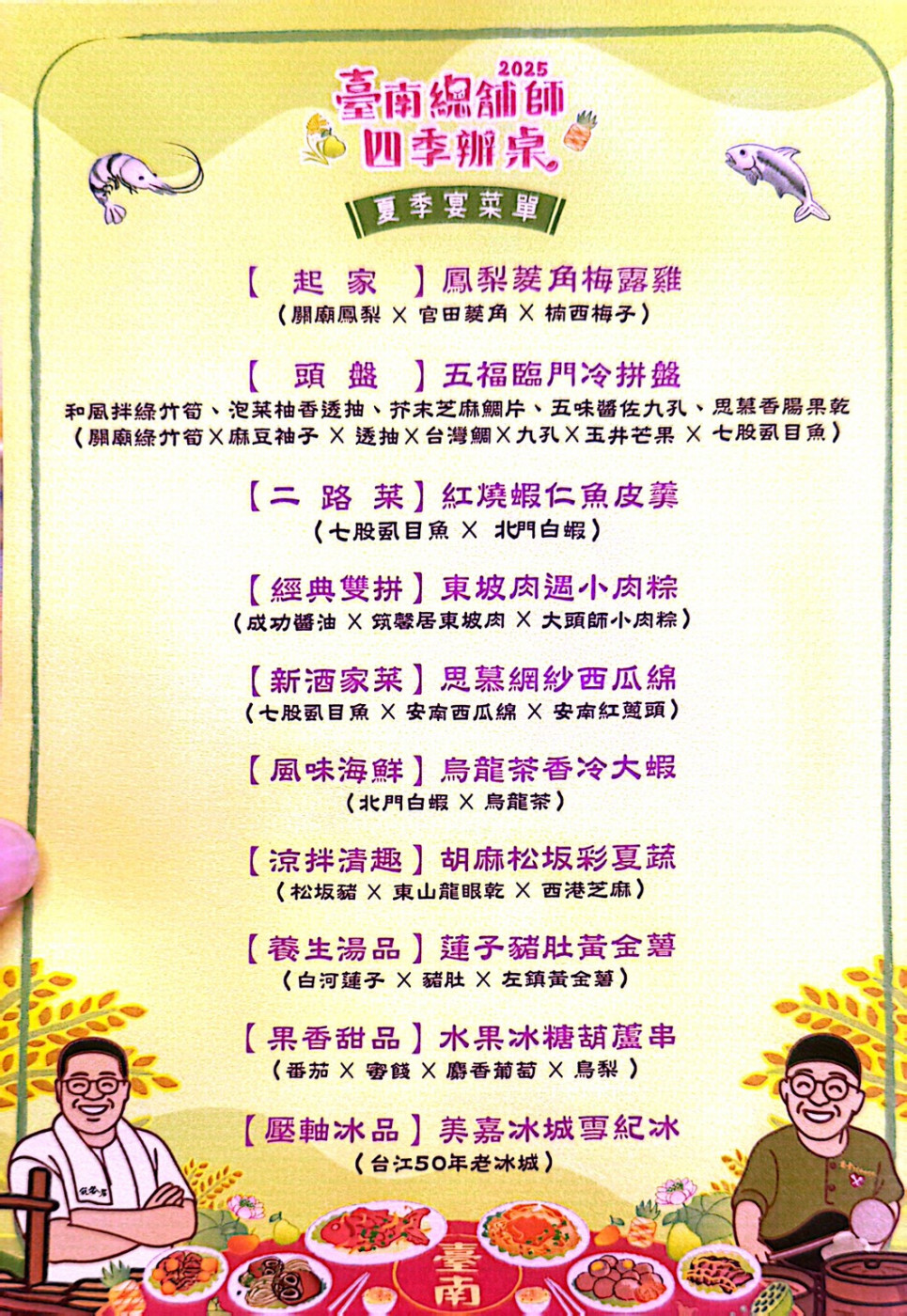 市長黃偉哲表示,這次菜單延續古早辦桌文化與地方節氣精神,精選台南盛產的七股虱目魚、北門白蝦、安南紅蔥頭、西瓜綿、官田菱角、西港芝麻、白河蓮子與台灣鯛等台南在地食材。每一道菜都蘊含著總舖師對台灣味的細膩詮釋與對辦桌文化的傳承。